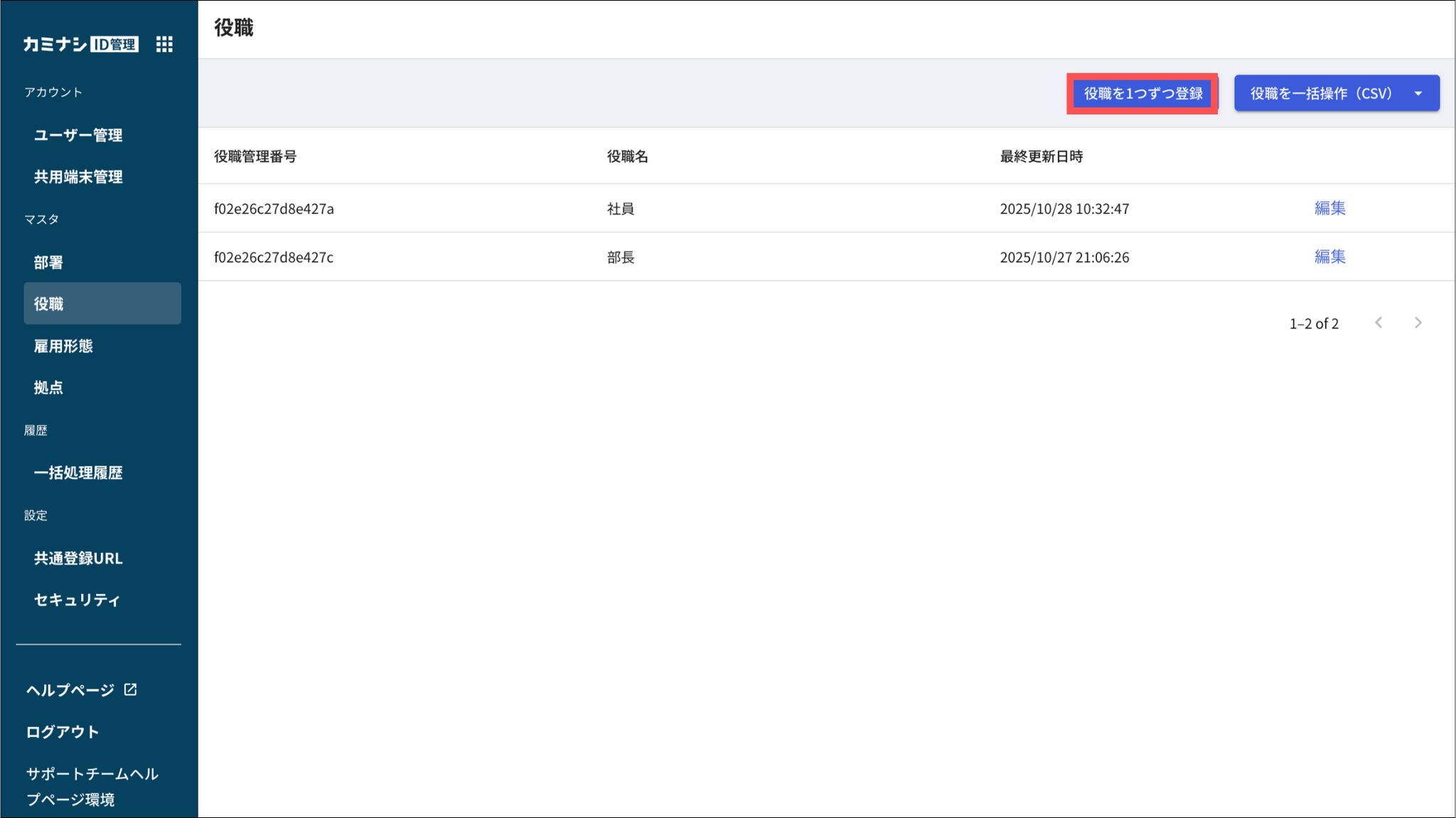 登録例として「役職」を登録するときの画像を用いています。「雇用形態」や「拠点」でも手順は同じとなります。