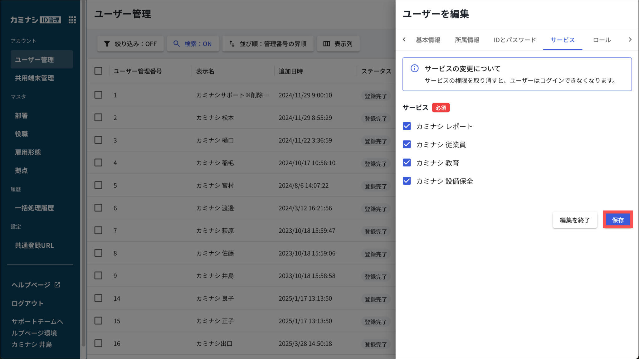 すでに他サービスで登録済みのユーザーがいる場合、新たに「カミナシ設備保全」を利用できるようにするには、そのユーザーに「カミナシ設備保全」のサービス利用権限を付与する必要があります。