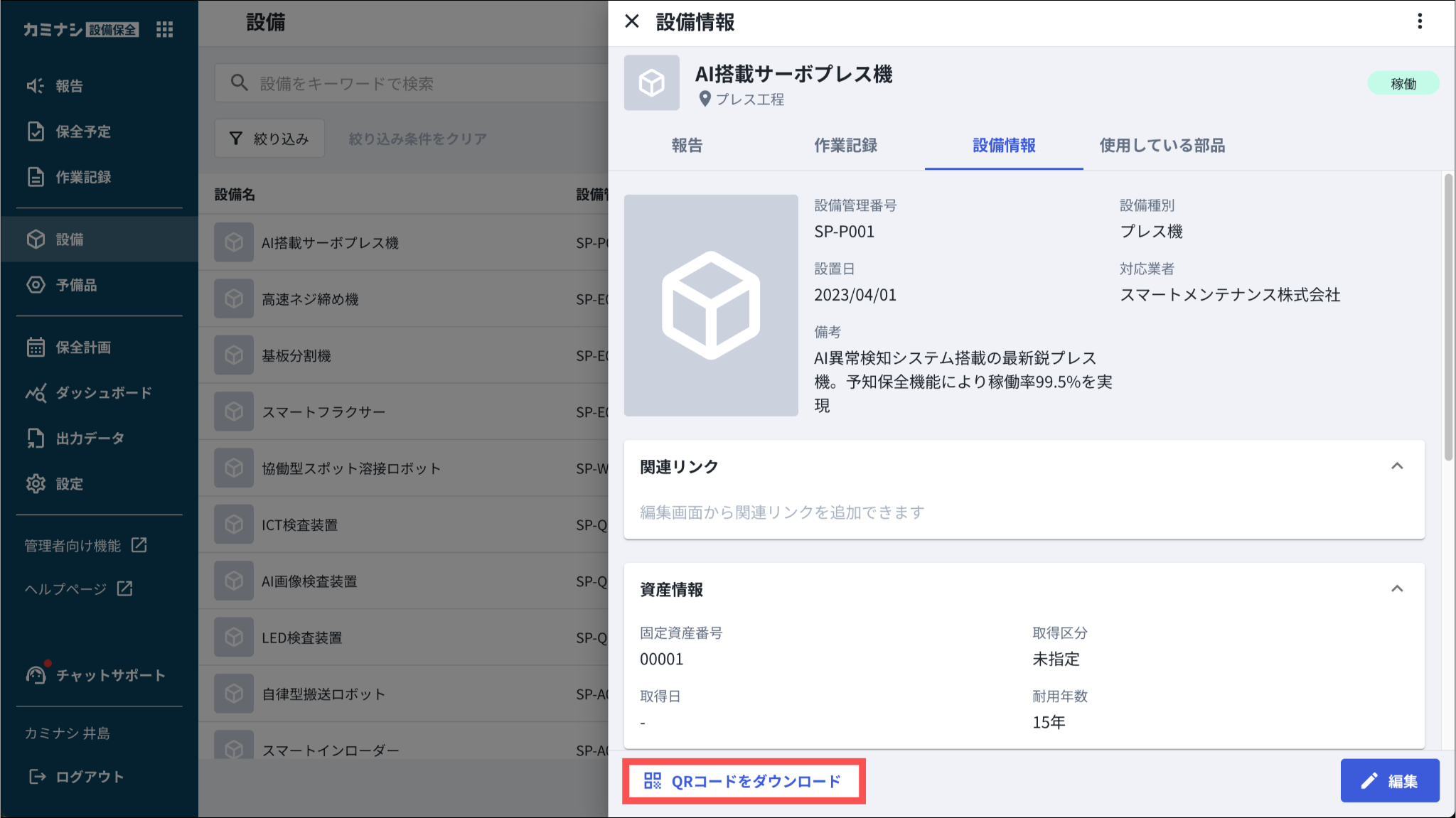 1.カミナシ設備保全にログインする2.「設備」を開き、QRコードをダウンロードする設備を押す▼モバイル端末の画面3.「設備情報」にある「QRコードをダウンロード」を押すQRコードをモバイル端末で読み取り、作業記録や報告を作成することができます。詳細については以下をご参照ください。QRコードから報告を作成するQRコードから作業記録を作成する※QRコードは株式会社デンソーウェーブの登録商標です。よくある質問は、こちらからご確認ください。