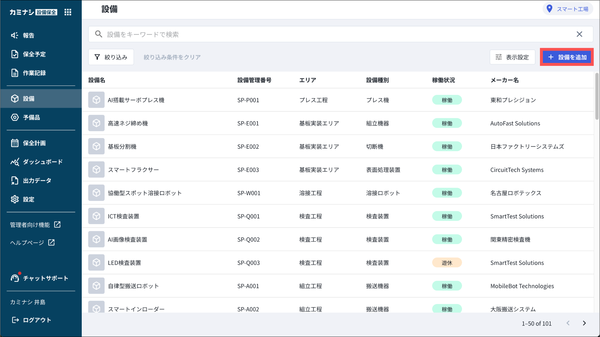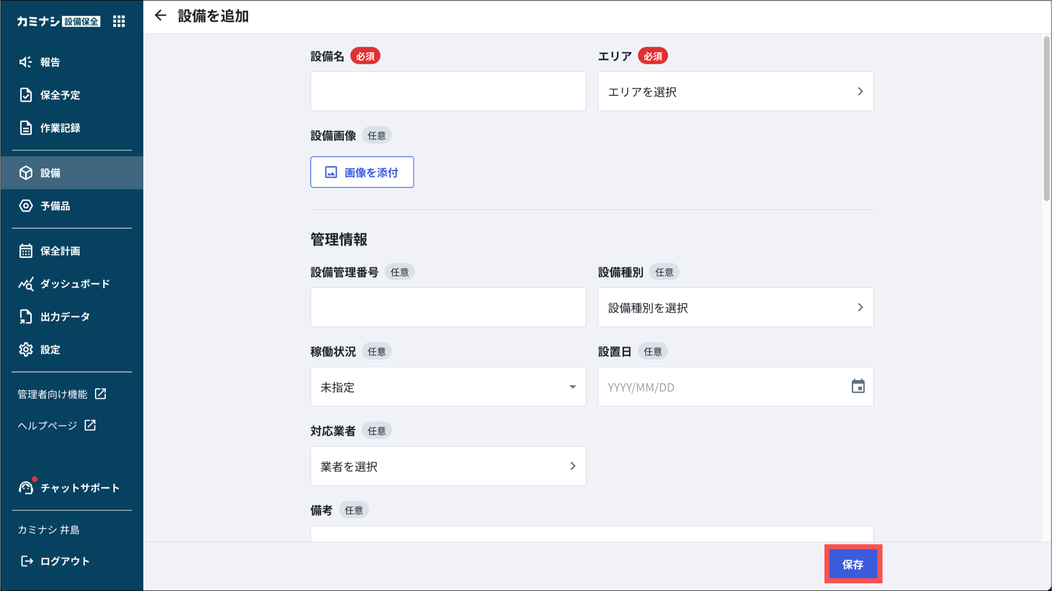 1.カミナシ設備保全にログインする2.「設備」を開き、「設備を追加」を押す「設備を追加」はモバイル画面から行うことはできません。3.設備情報を入力し、「保存」を押すよくある質問は、こちらからご確認ください。