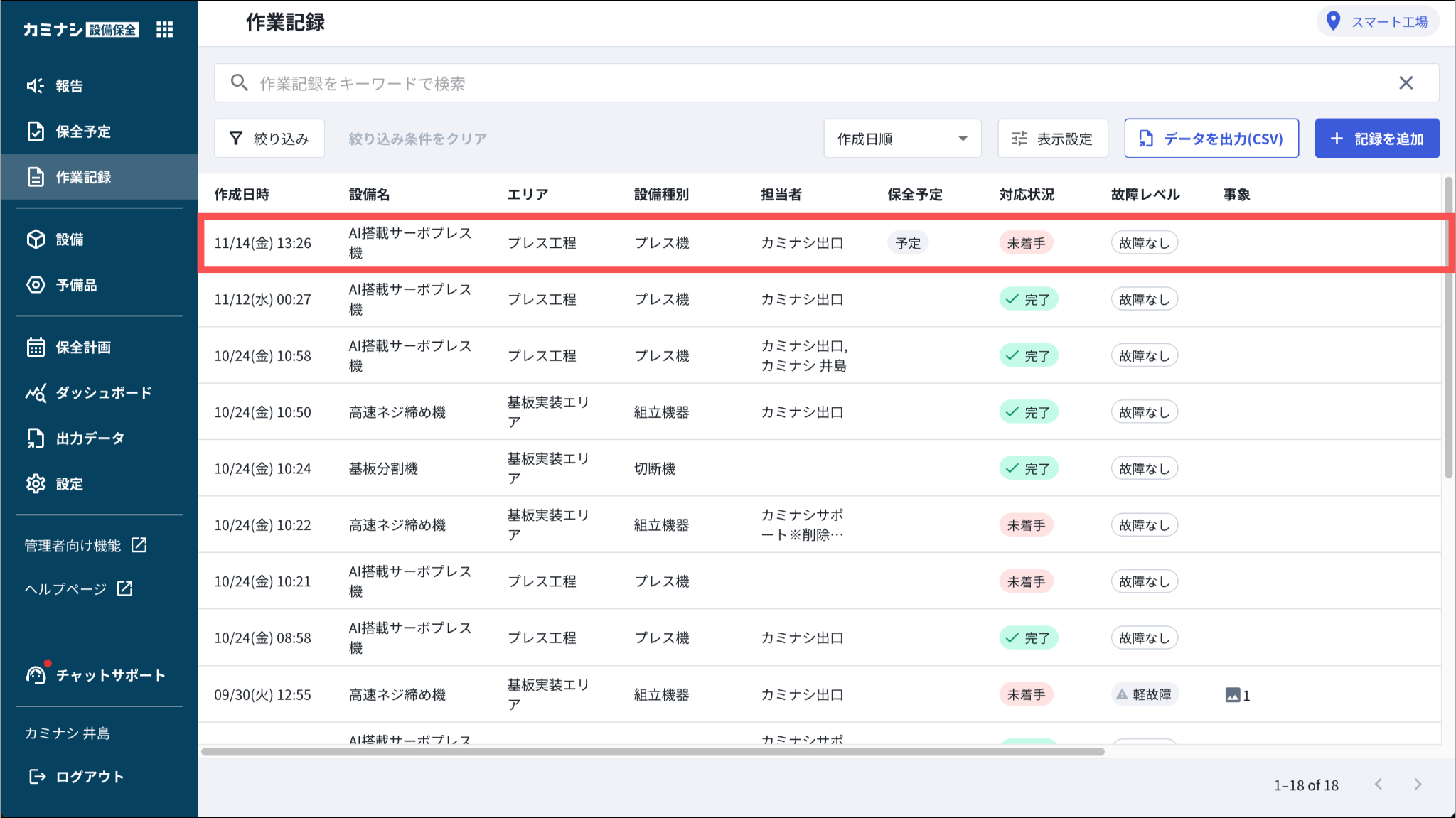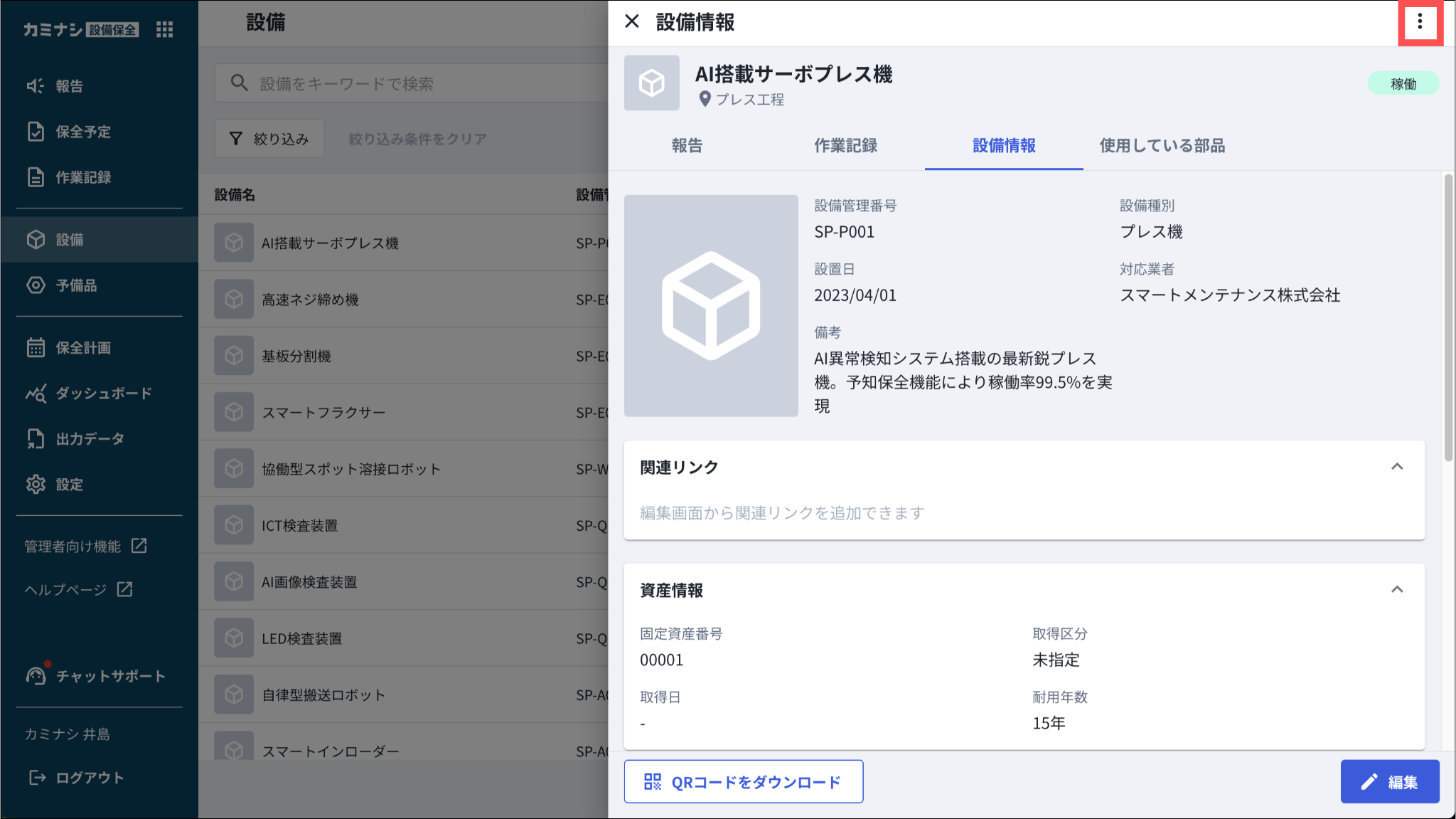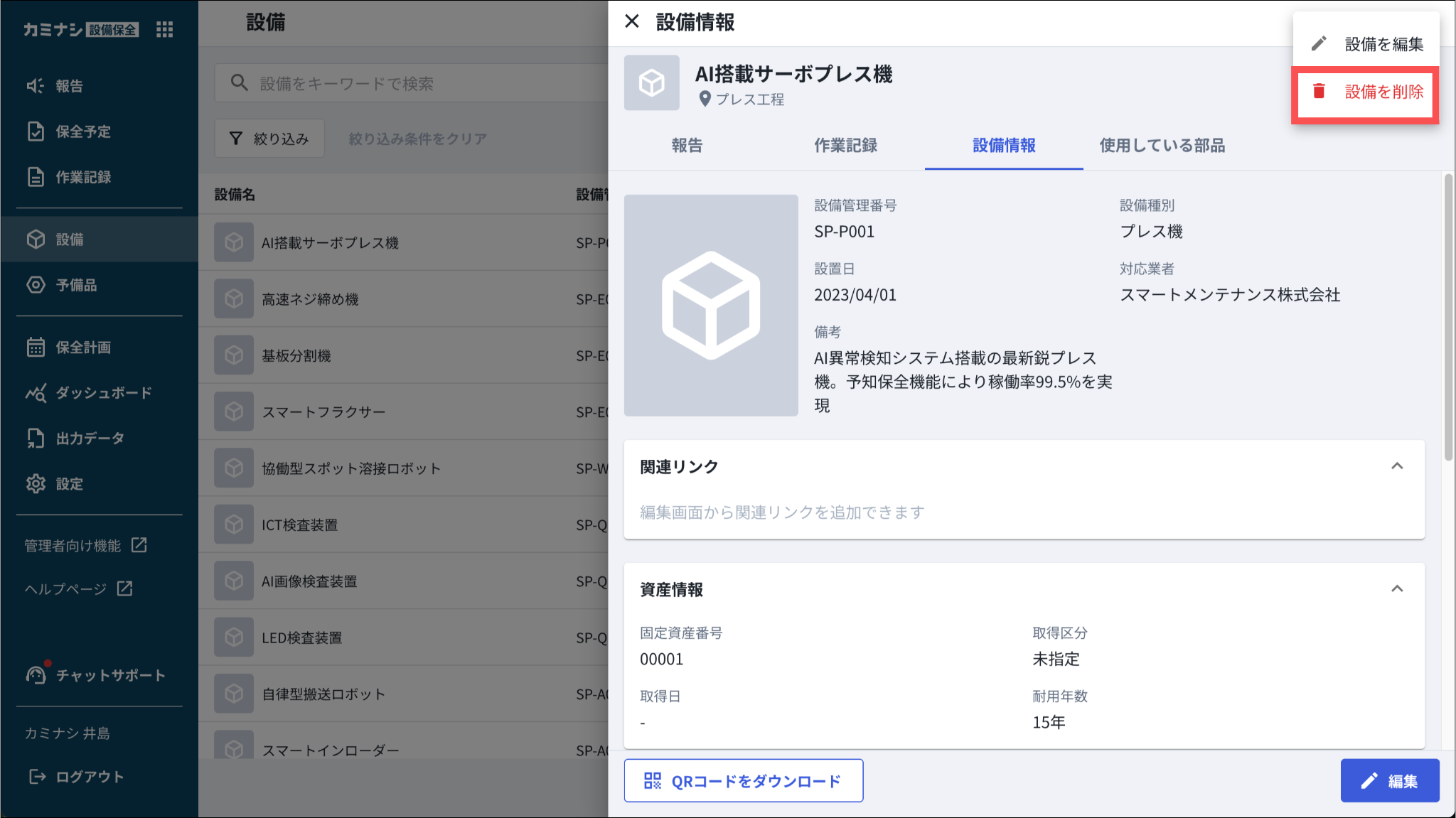 1.カミナシ設備保全にログインする2.「設備」を開き、削除する設備を押す▼モバイル端末の画面3.「︙」を押す5.「設備を削除」を押す一度削除された設備は復元できませんのでご注意ください。また、作業記録が作成されている場合は削除することができません。よくある質問は、こちらからご確認ください。