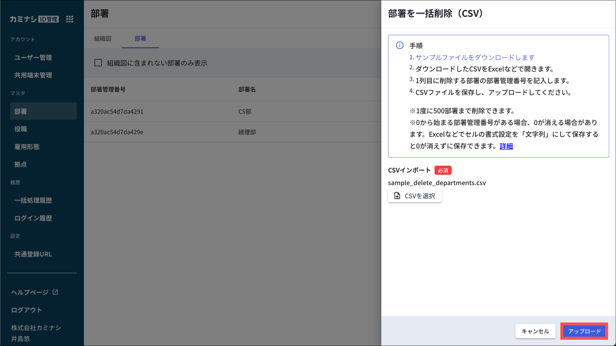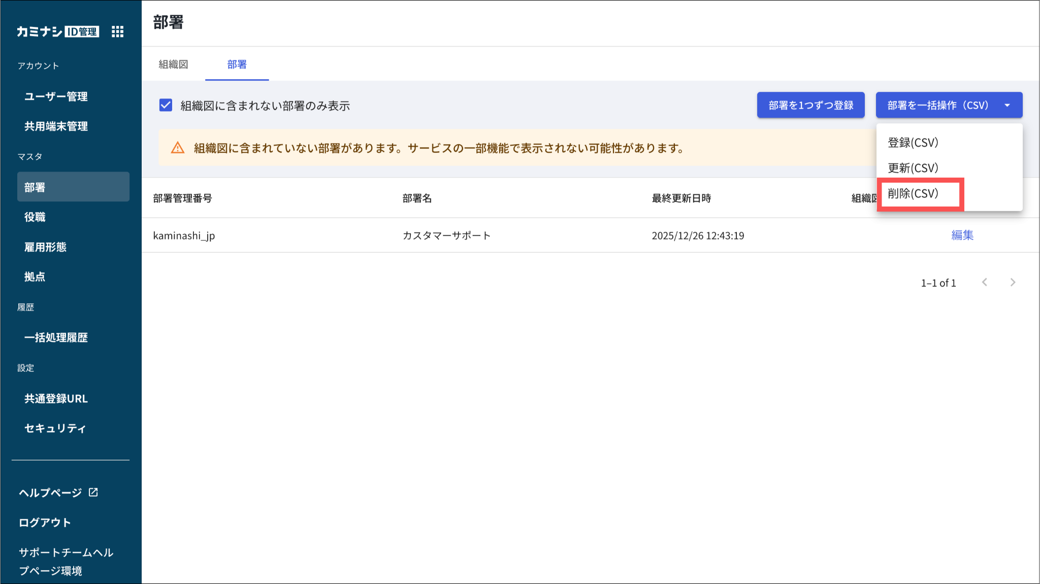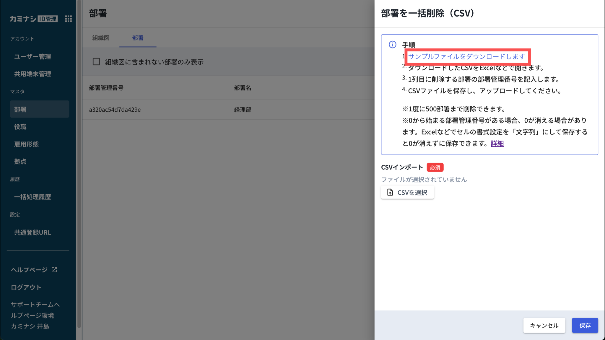 部署をCSVで一括削除する