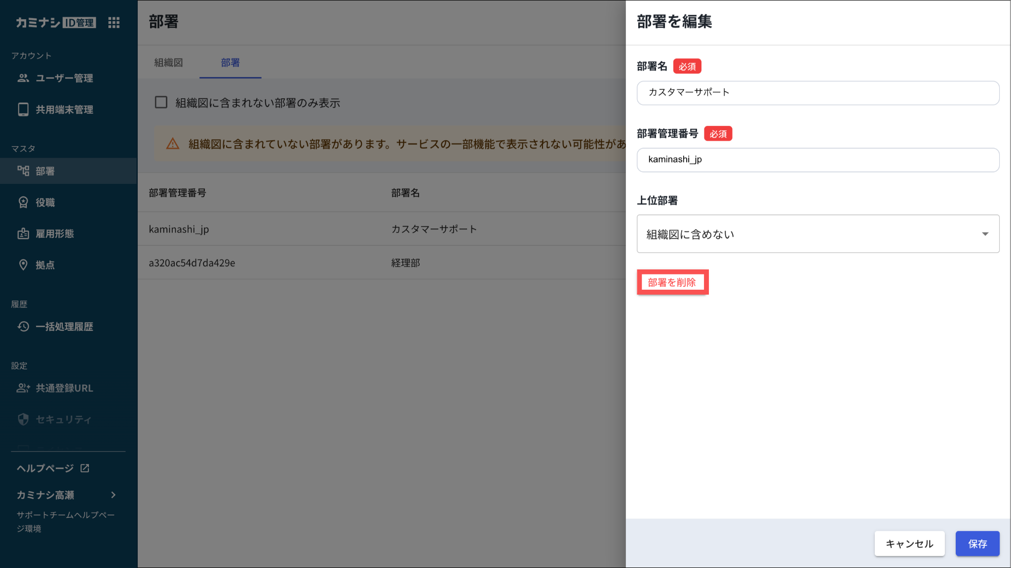 組織図に登録されていない、かつユーザーに紐づいていない部署のみ削除できます。
