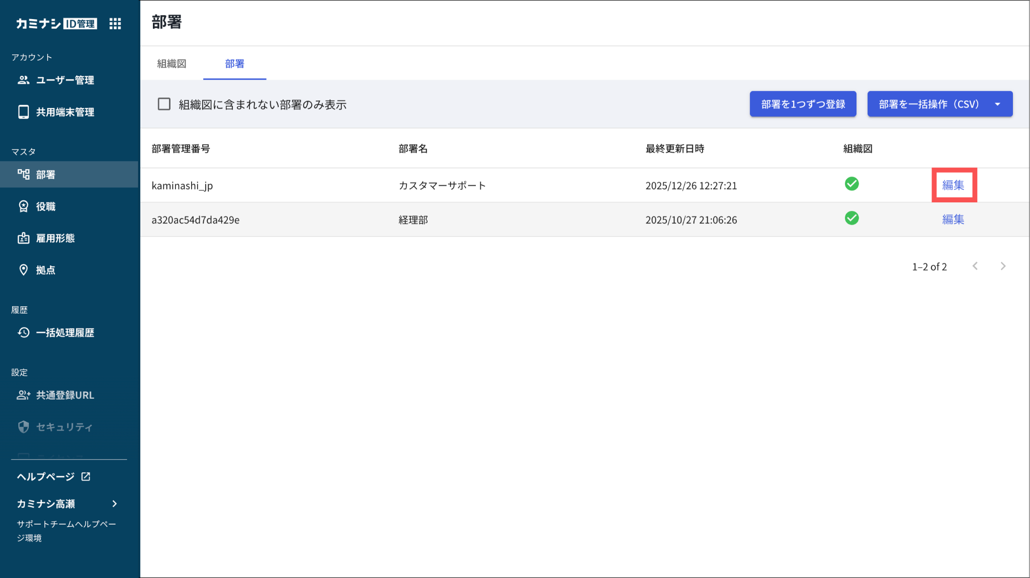 2.「部署」を開き、編集する部署の「編集」を押す
