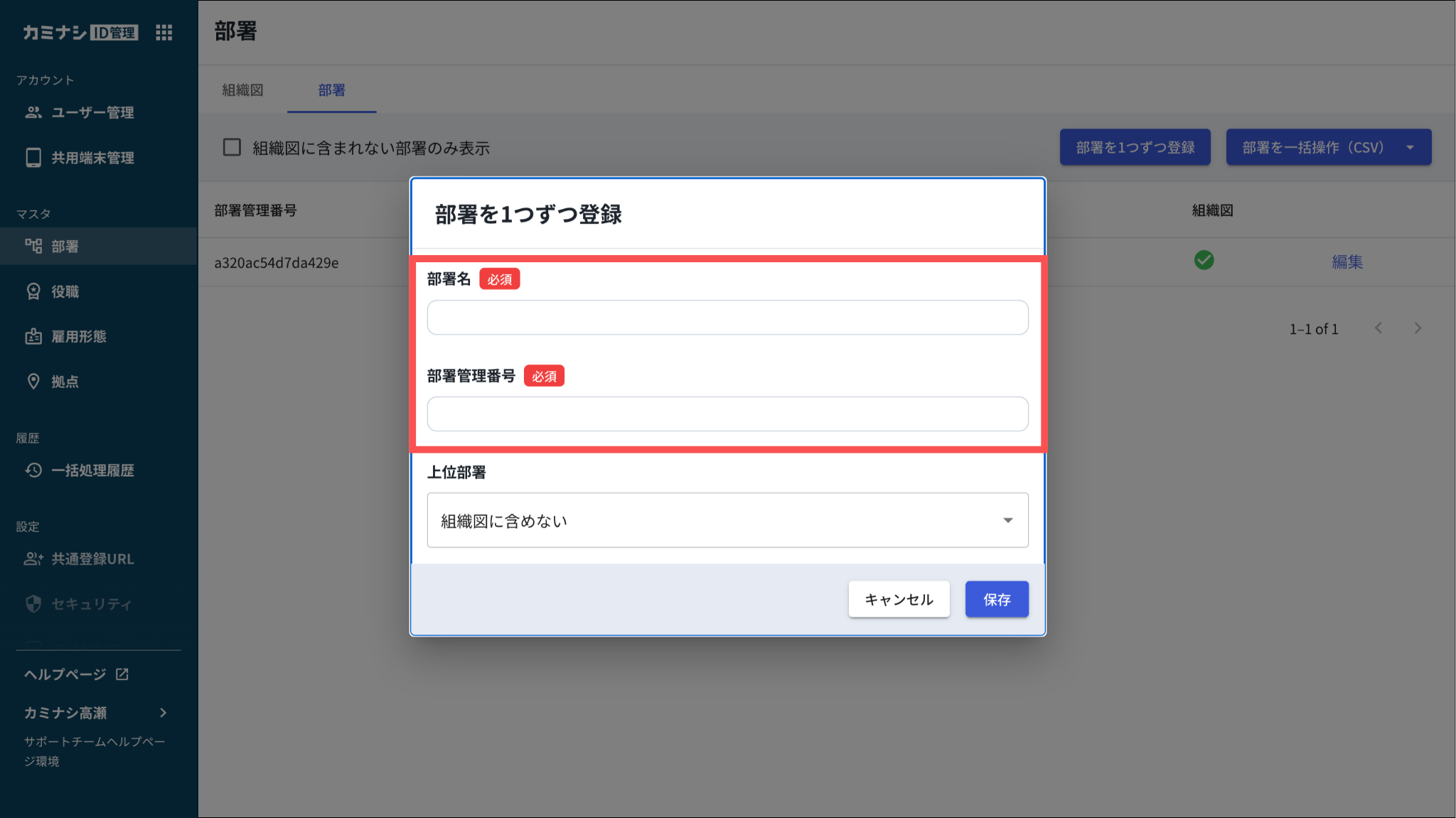特定の部署の下に置く場合は、親となる部署名を一覧から選択してください。