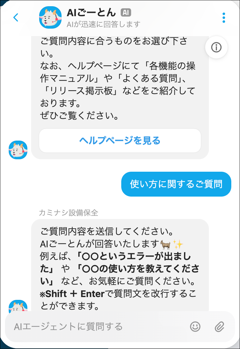 ※エラーが発生した場合、エラー文言を送信いただくことで、AIが対応できる場合がございます