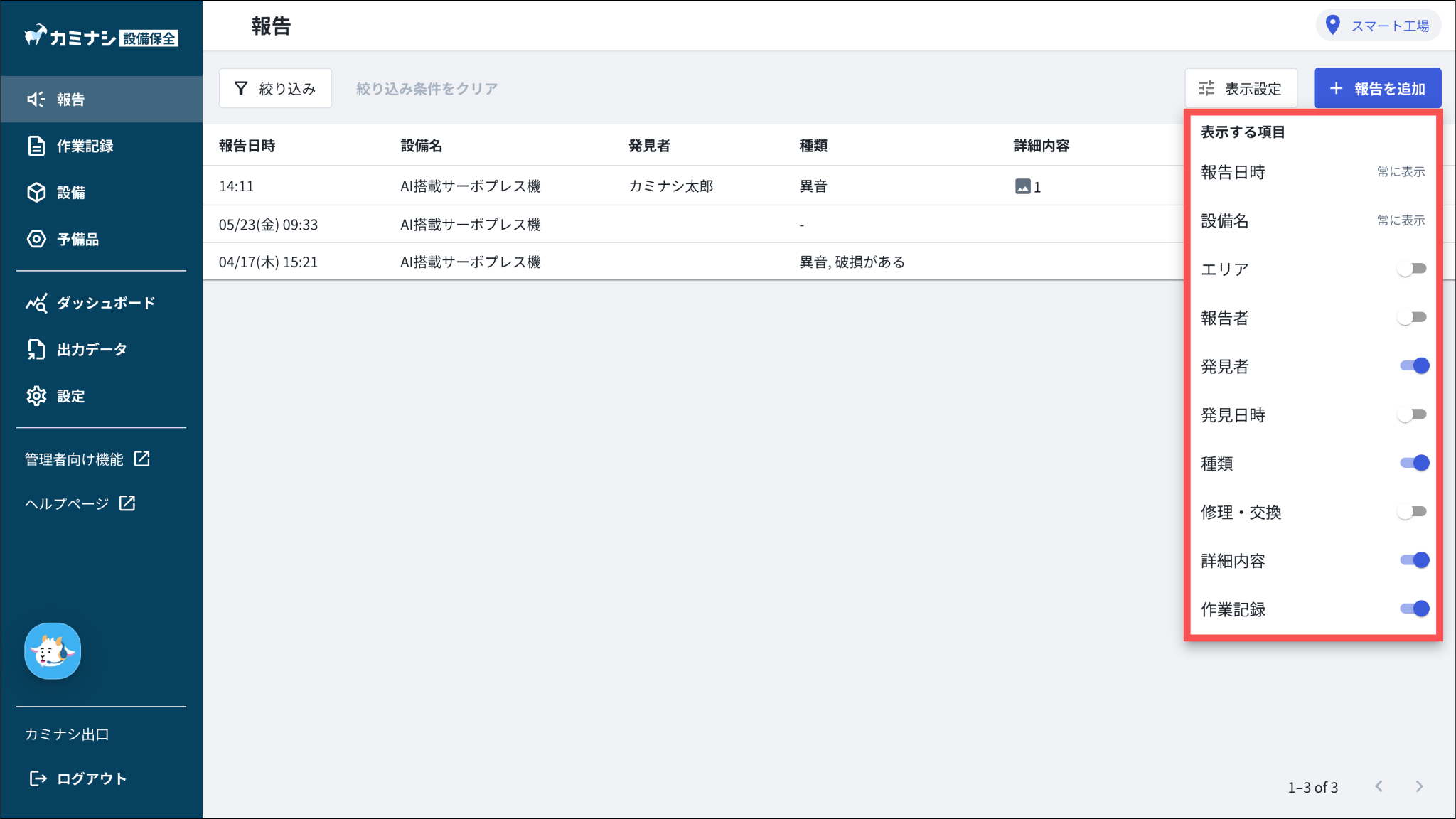 「報告日時」「設備名」は常に表示され、表示/非表示の変更はできません。