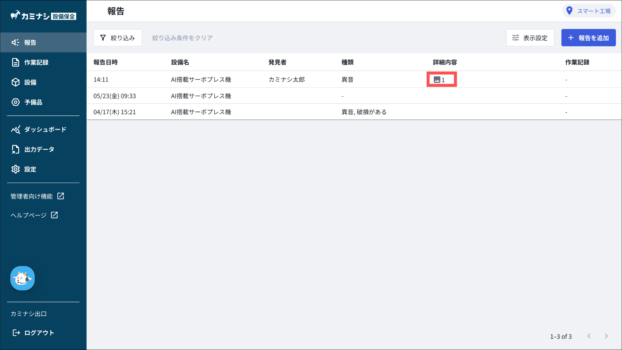 今回のリリースで、画像や動画が含まれる報告には「詳細内容」にアイコンが表示されるようになりました。