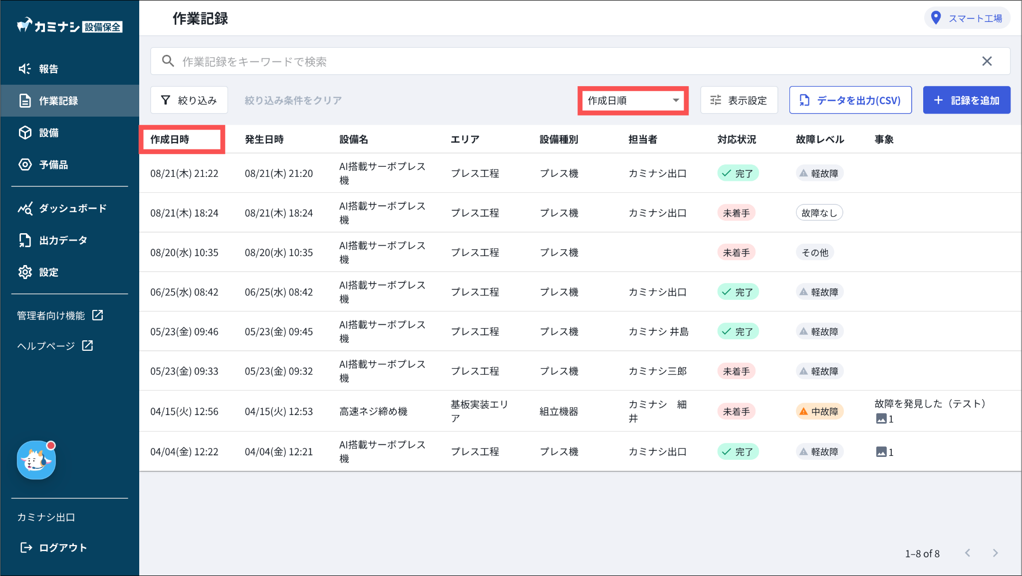 これまで「作業記録一覧」は「発生日時」を基準として並べ替えされていました。