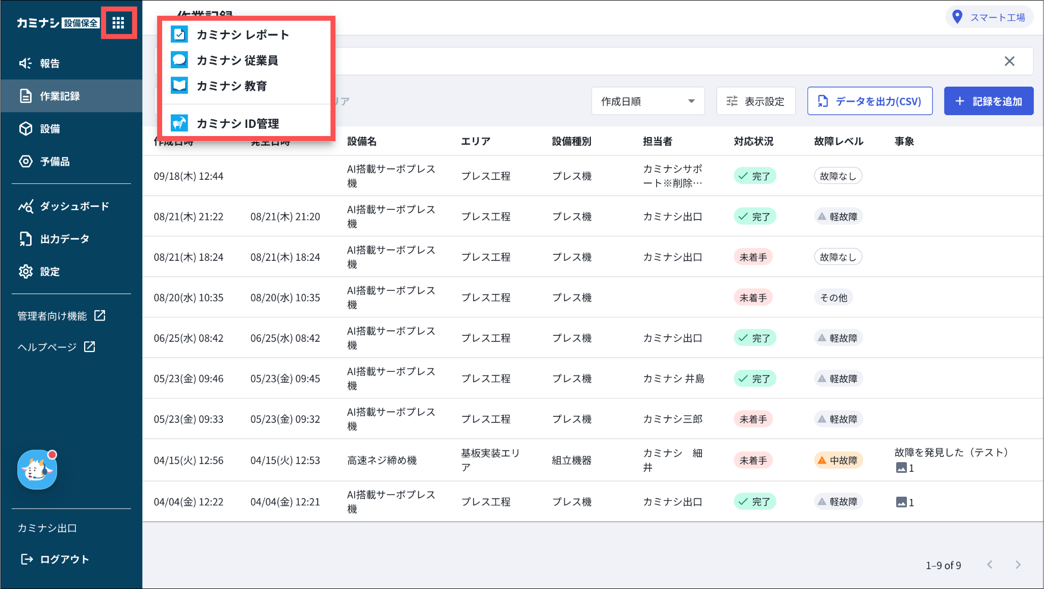 これまでカミナシ設備保全管理画面では、左メニューに「カミナシID管理」と表示され、他のサービスへの導線を表示していました。