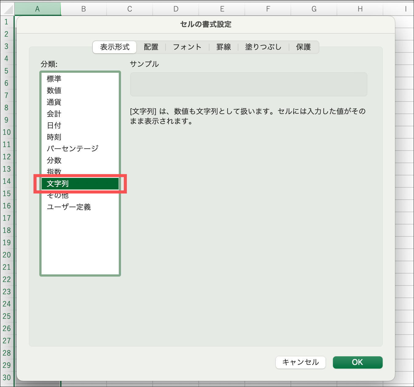 CSVファイルの編集時に、メニューから「セルの書式設定」を開き、「表示形式」>「分類」で「文字列」を選択し、「OK」を押します。