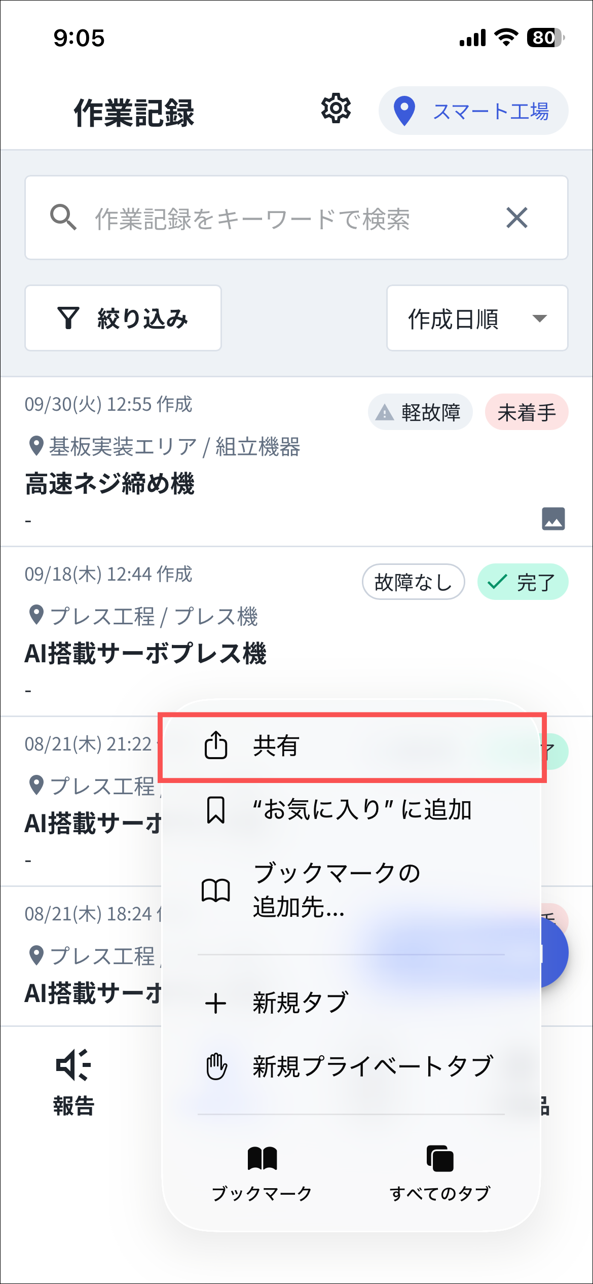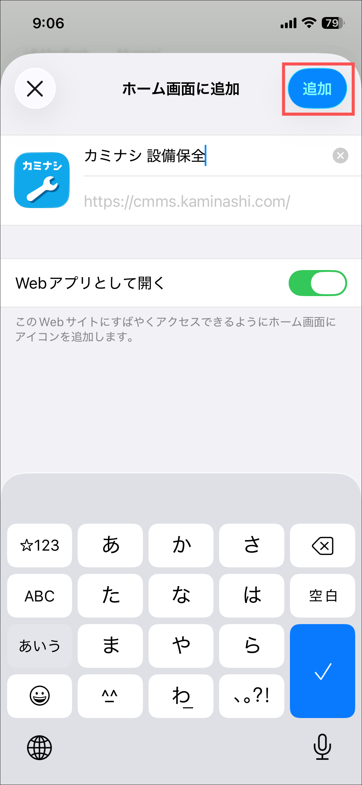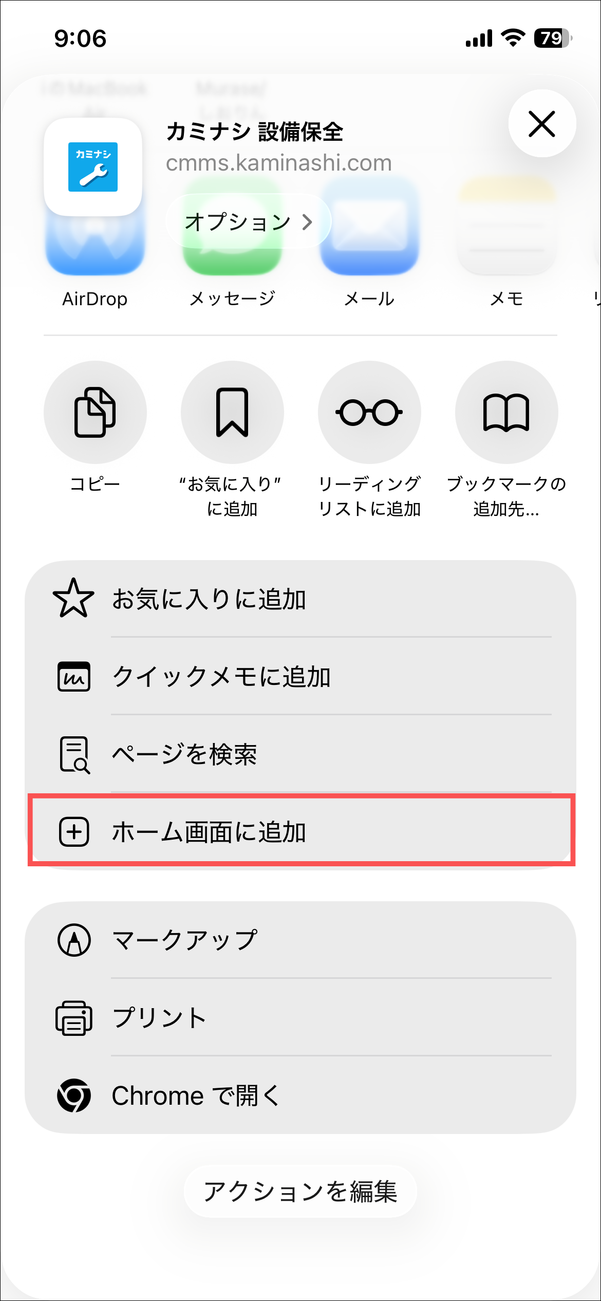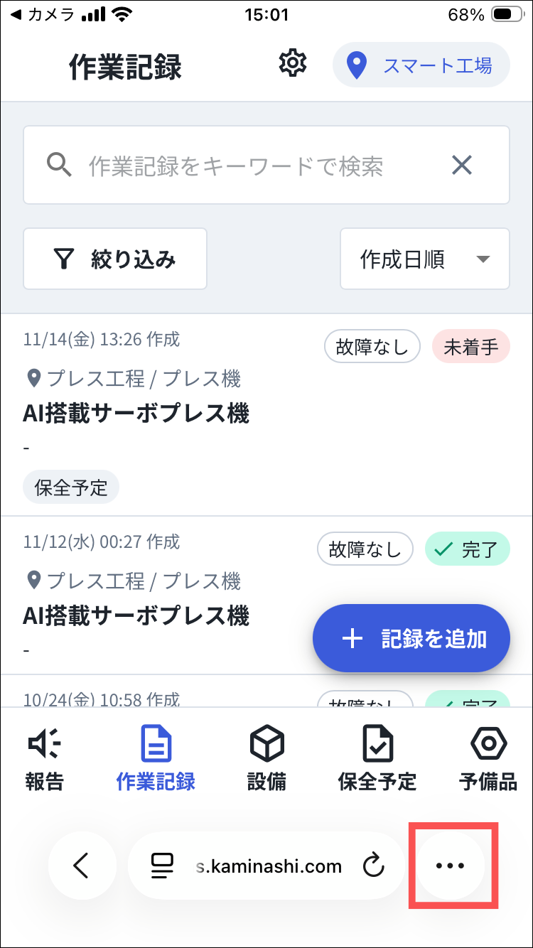 1.Safariでカミナシ設備保全にログインする2.画面の右下にある「⋯」を押す3.「共有」を押す4.「ホーム画面に追加」を押す5.「追加」を押す6.ホーム画面に追加されるよくある質問は、こちらからご確認ください。