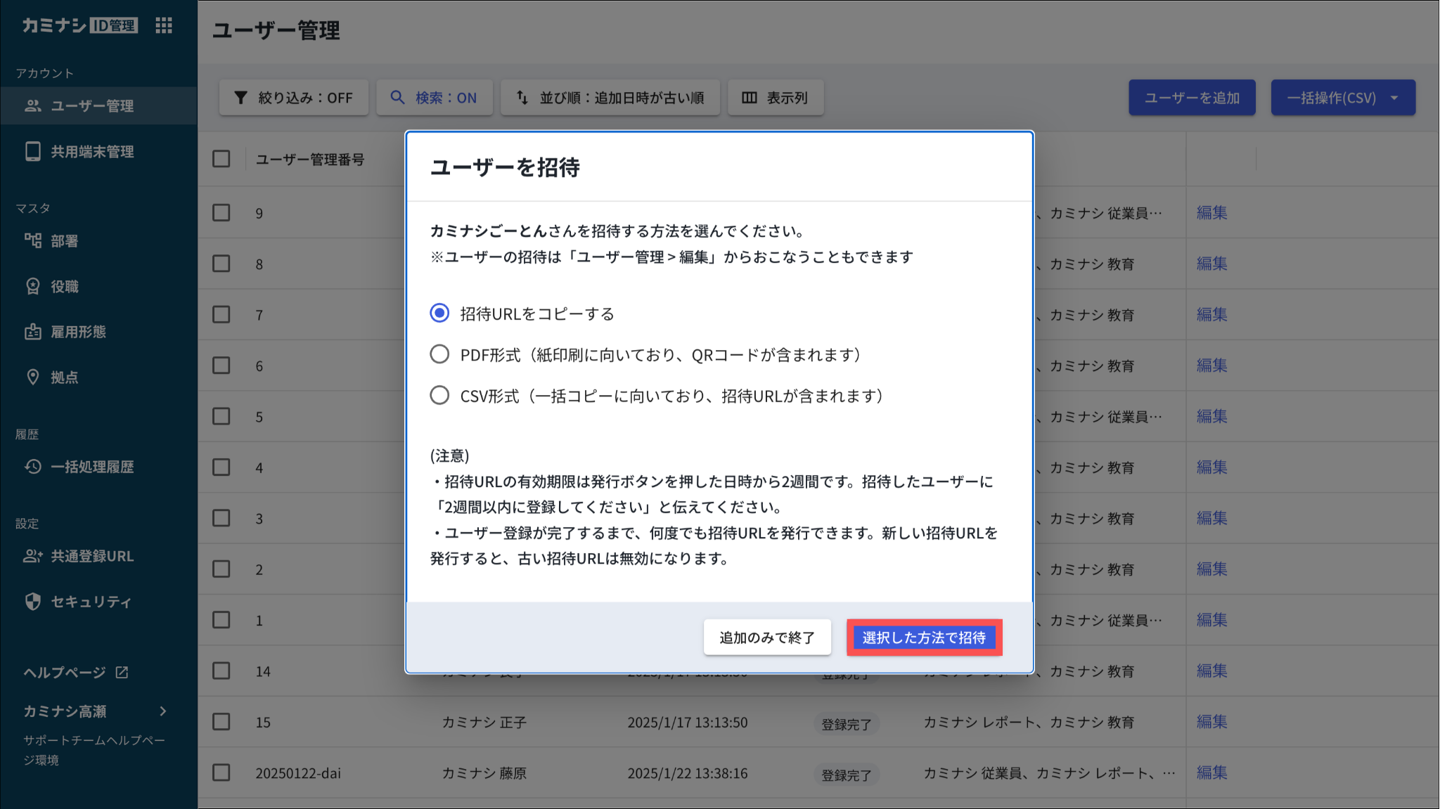 招待方法の詳細については、「追加したユーザーを個別に招待する:4.ユーザーの招待方法を選択する」をご参照ください。