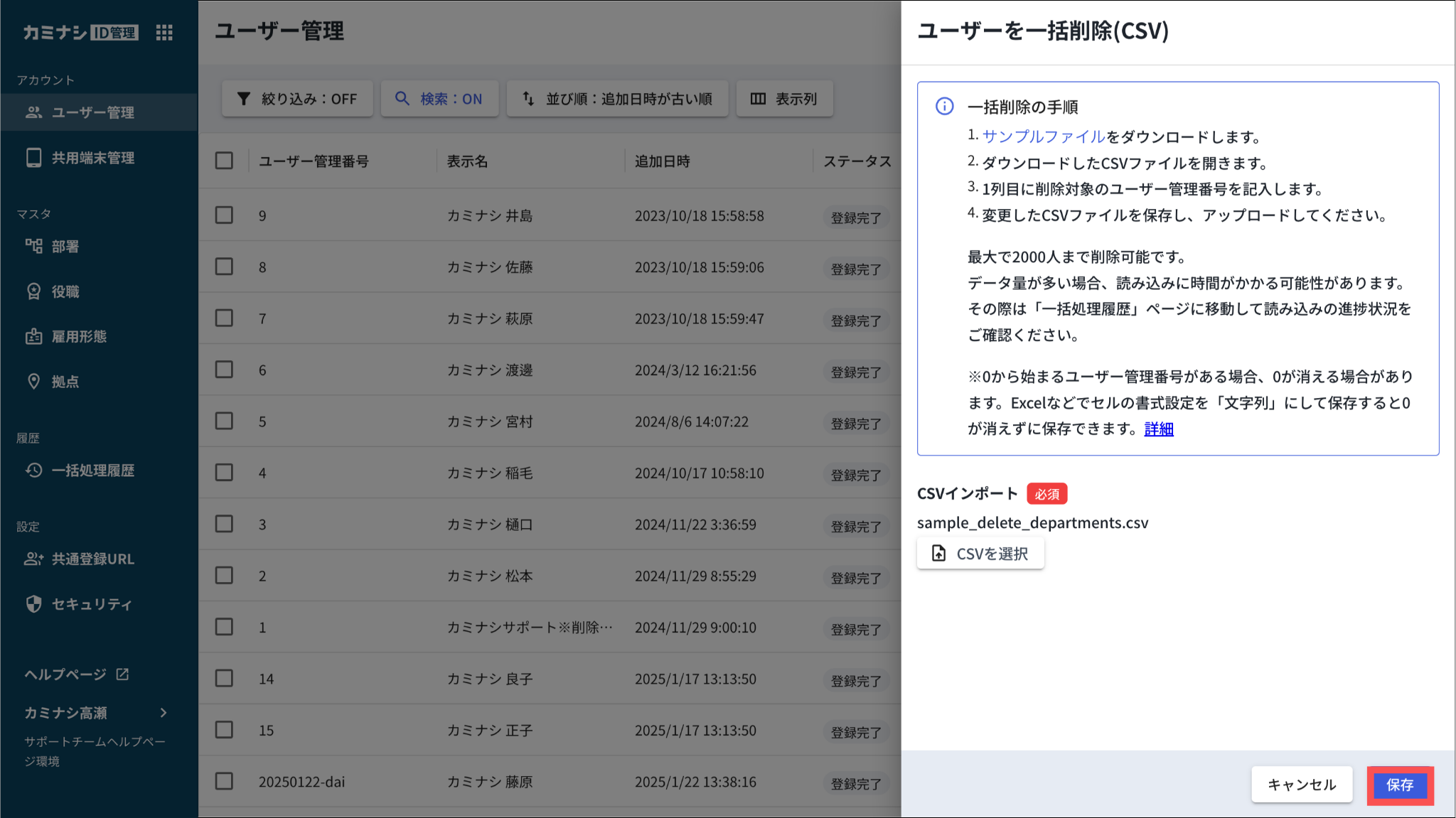 削除するユーザーの「ユーザー管理番号」を入力してください。