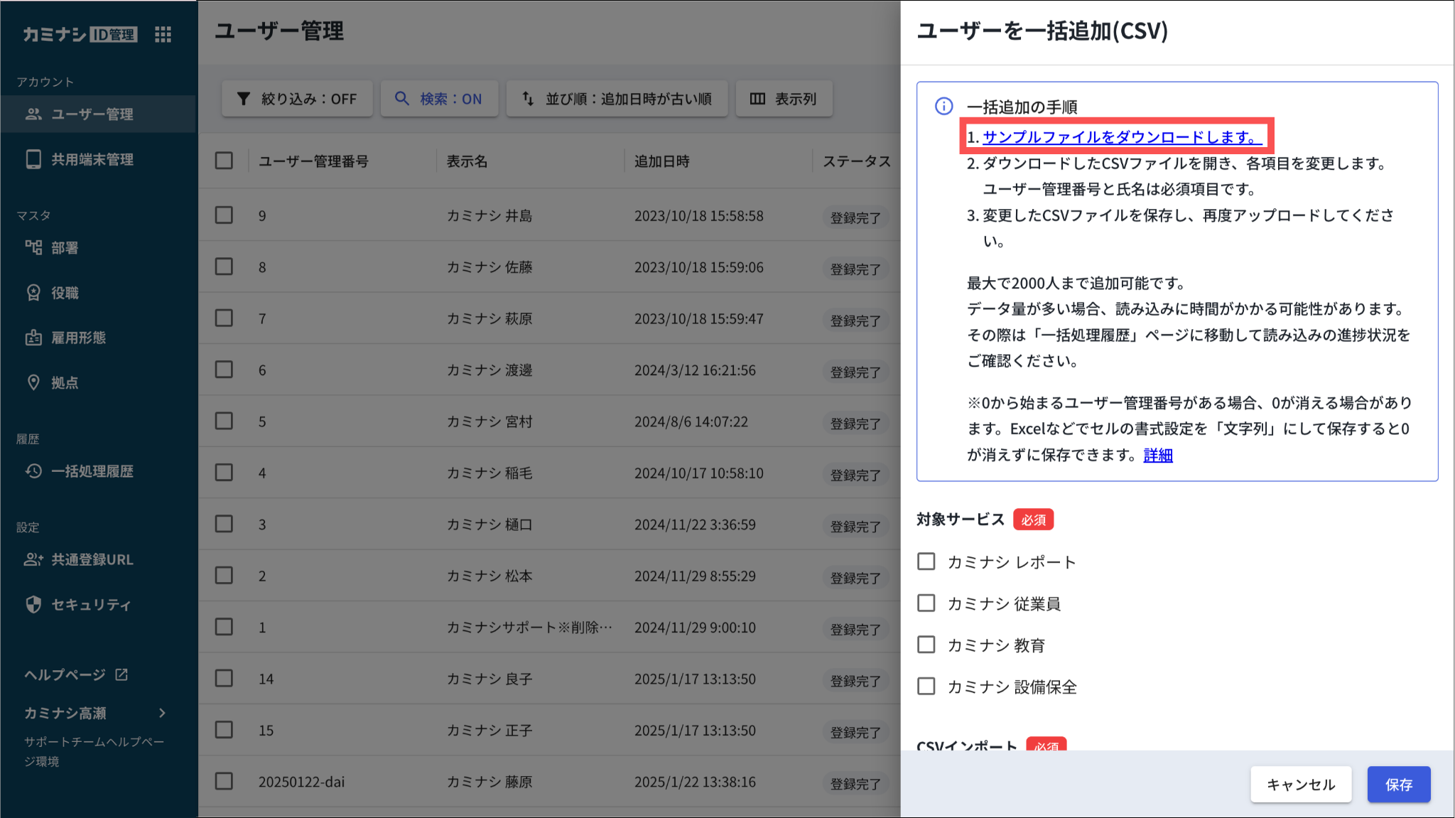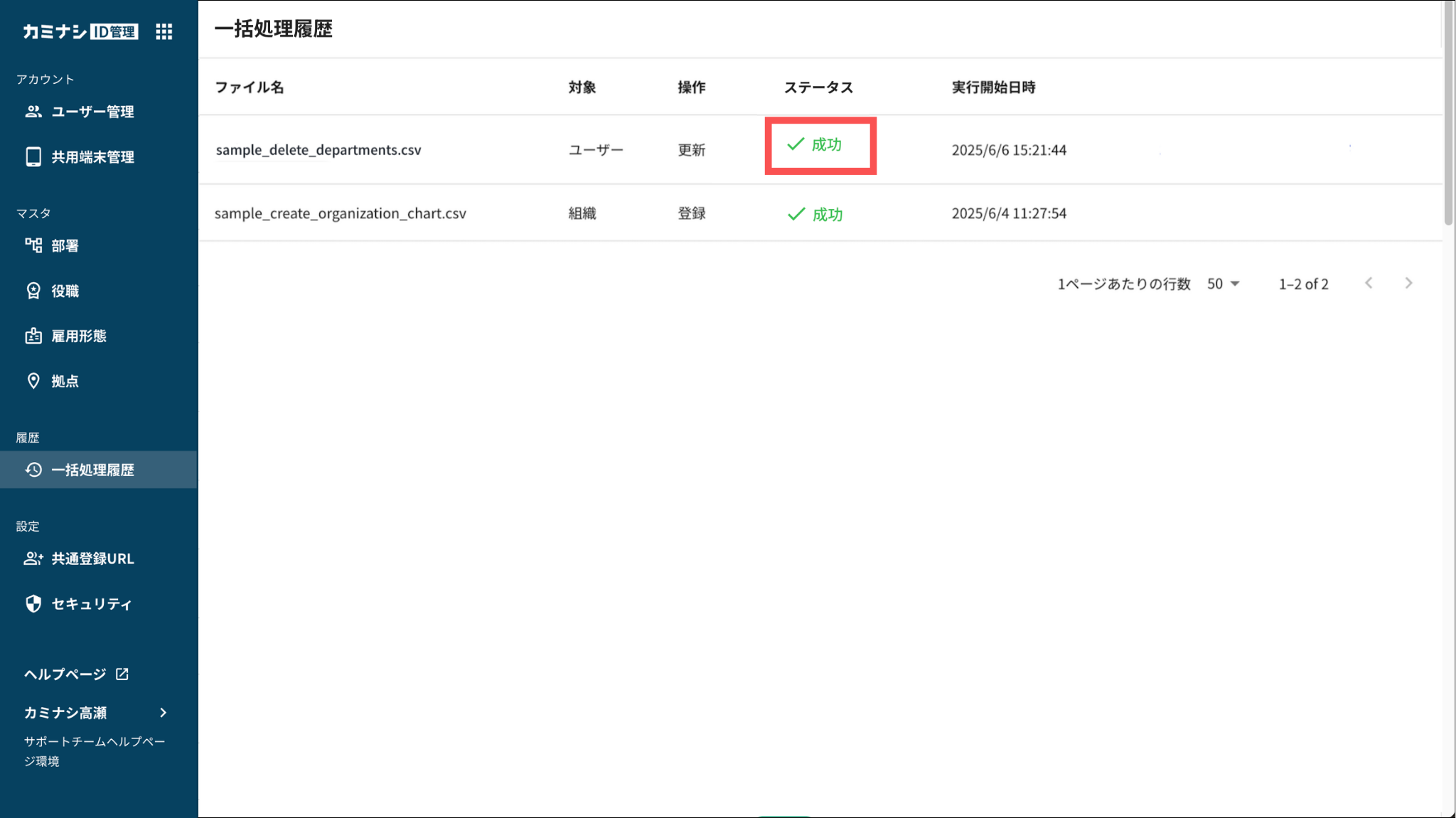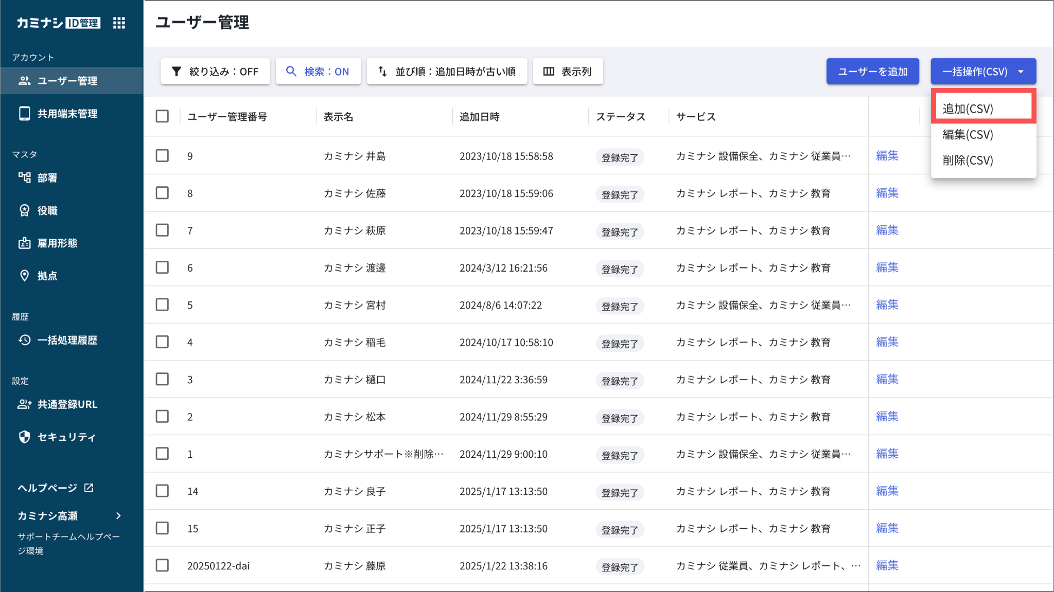 CSVファイルを使った一括登録では、主務の部署を設定することができます。