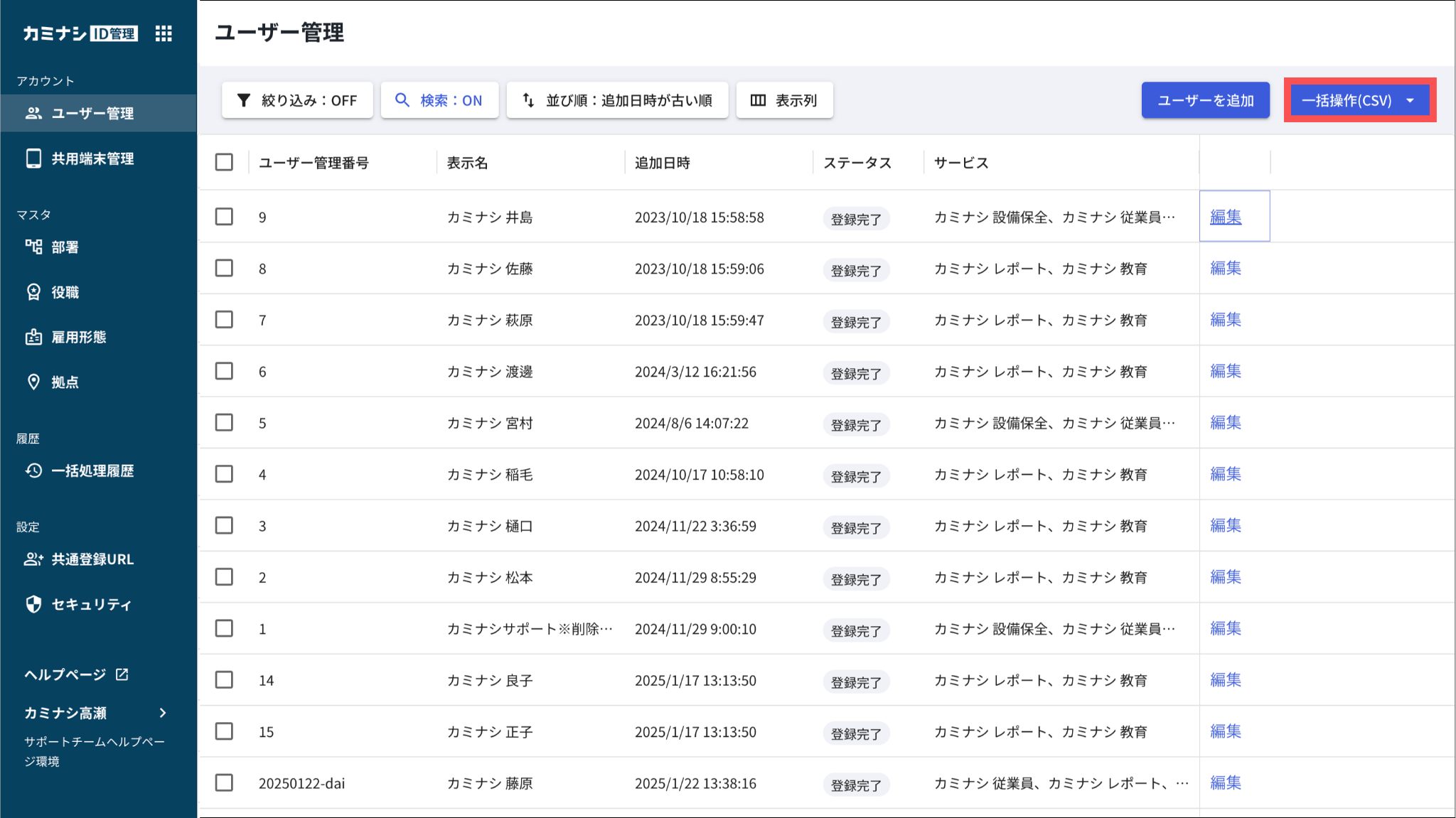 CSVファイルを使った一括編集では、ユーザー管理番号を一括で更新することはできません。