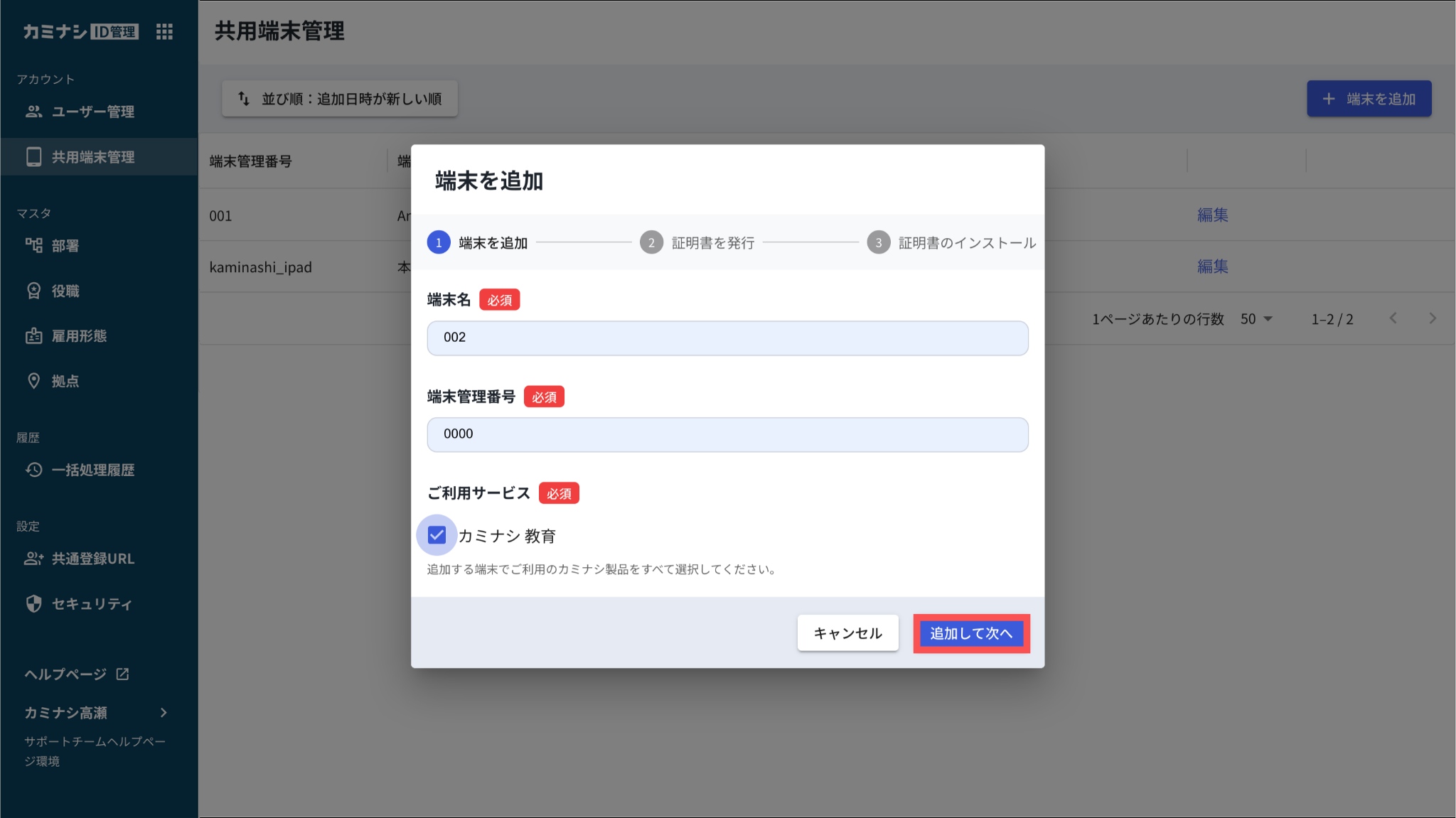 「追加のみで終了」を押すと証明書を発行せずに登録を終了します。