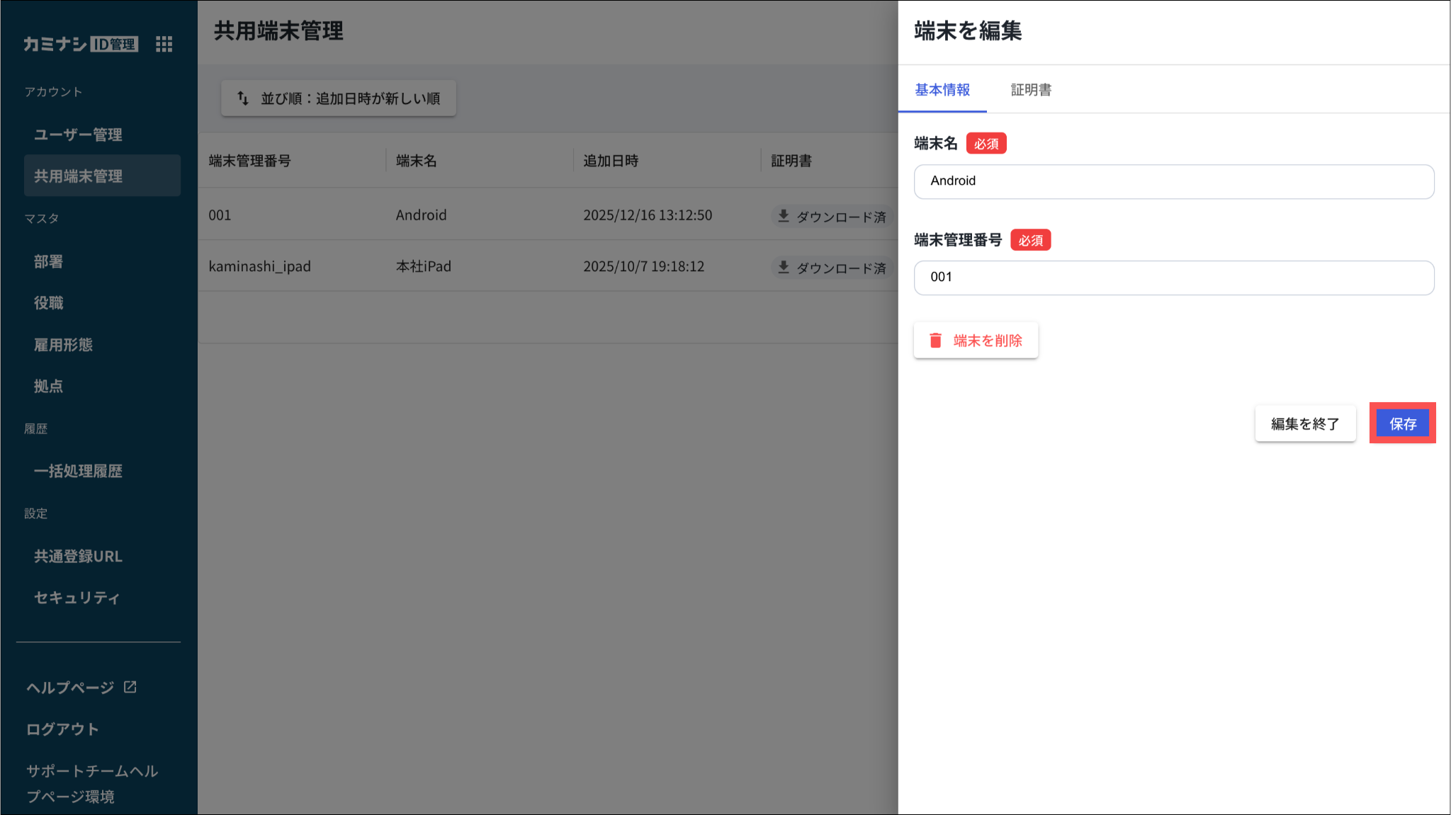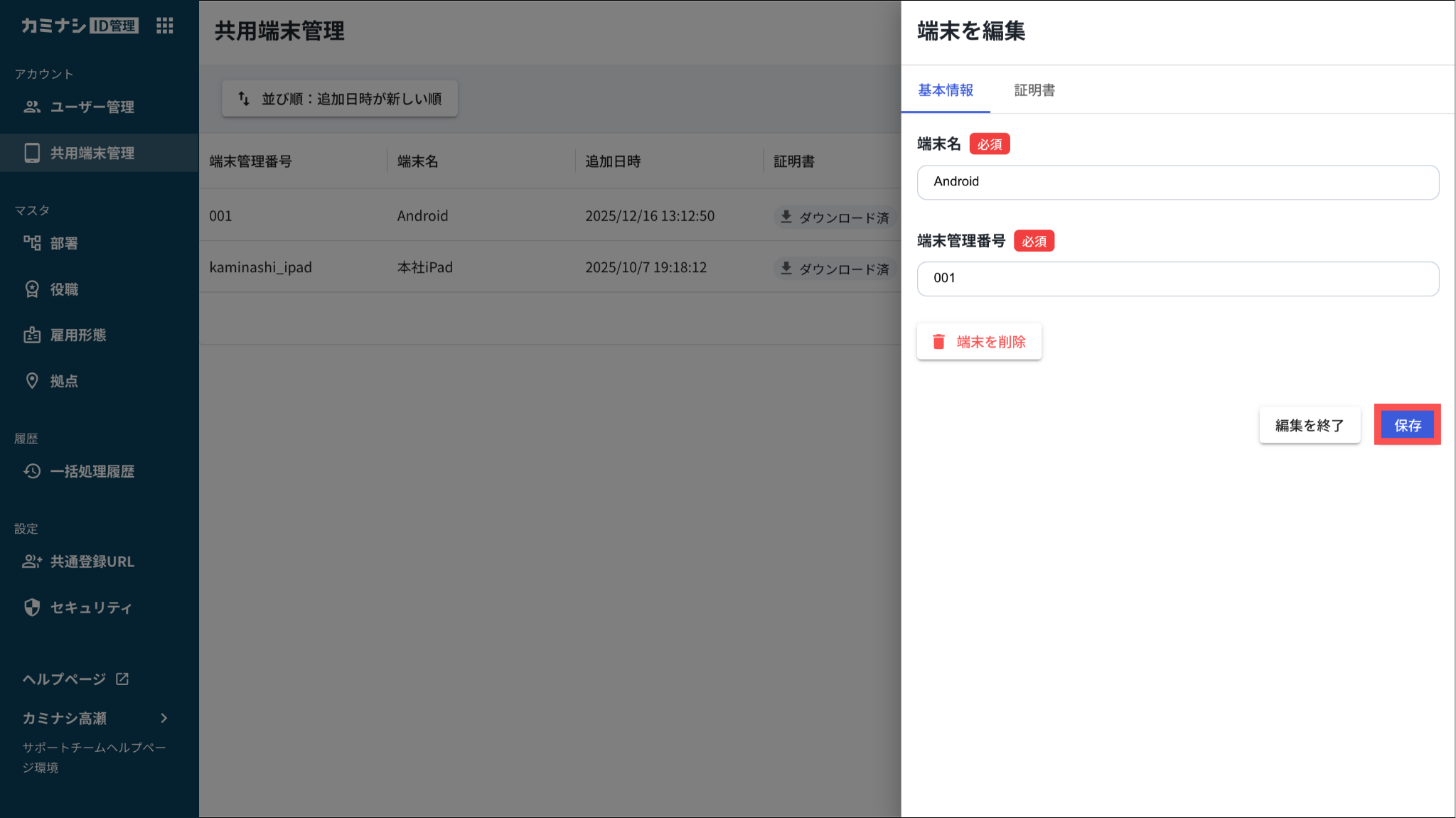 2.「共用端末管理」を開き、編集する共用端末の「編集」を押す