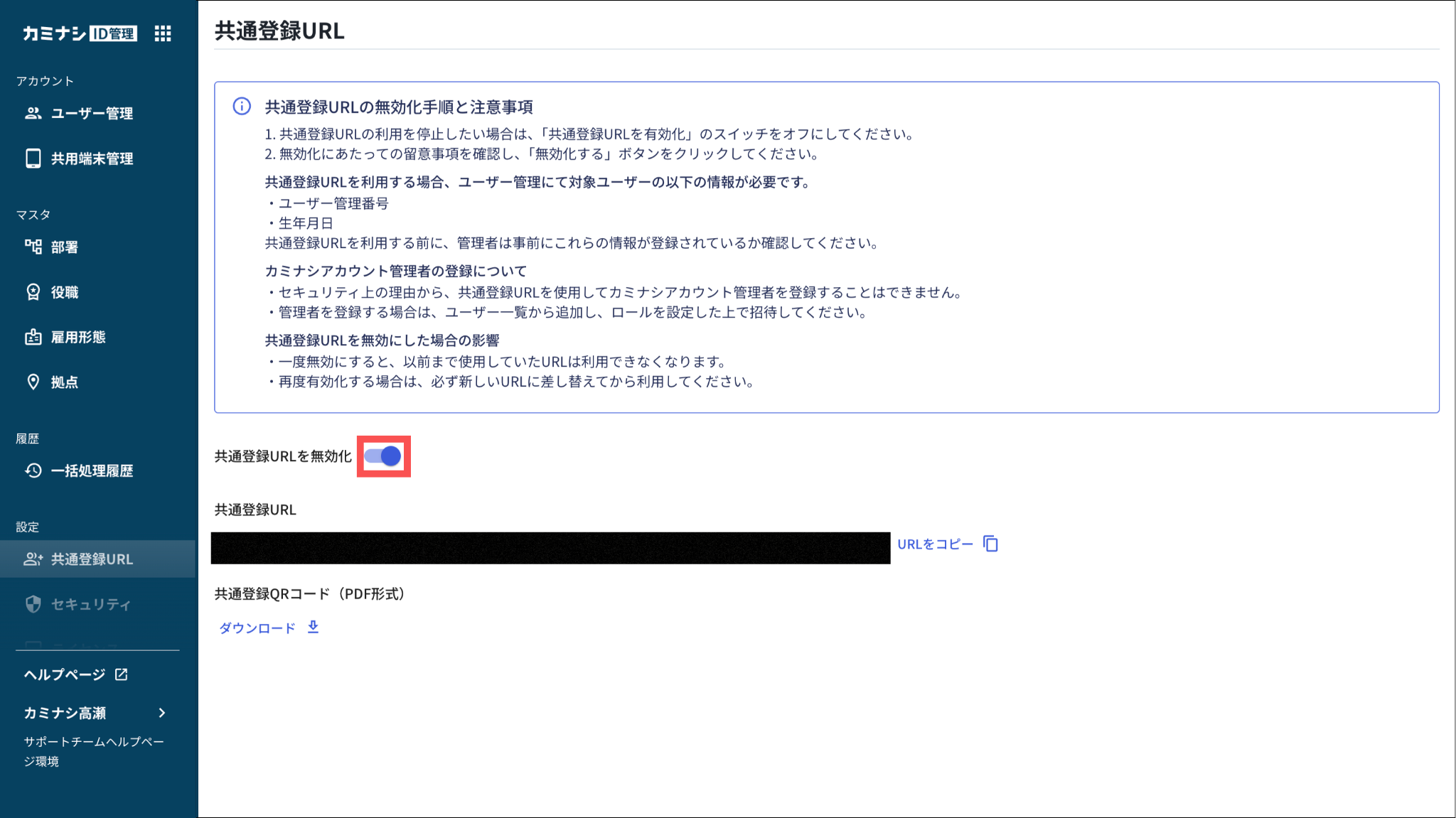 共通登録URLおよびそのQRコードは、発行後はいつでも削除・利用停止が可能です。