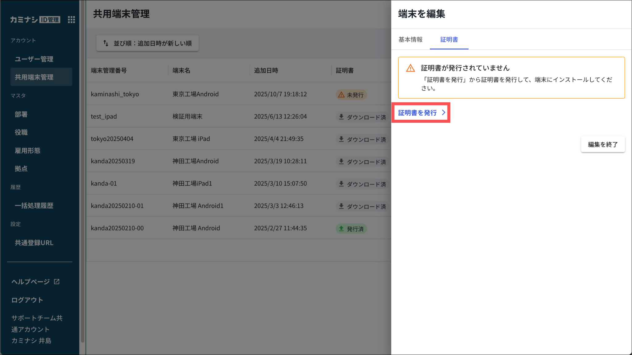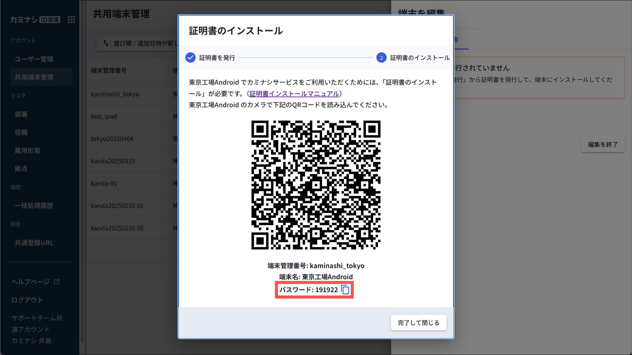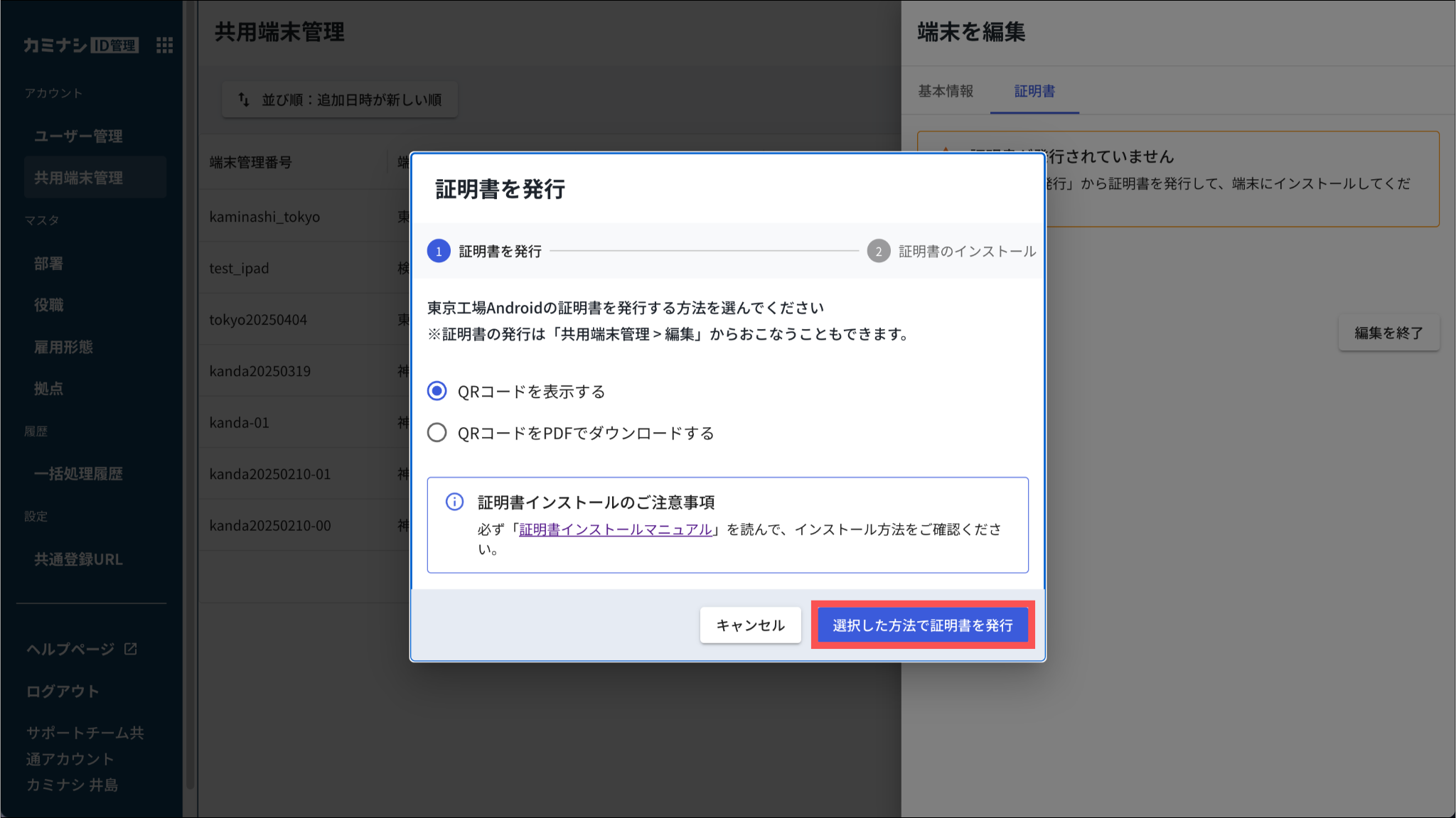 ※「QRコードを表示する」を選択した場合、iPadやAndroidでの証明書インストールが完了するまで、この画面は開いたままにしてください。