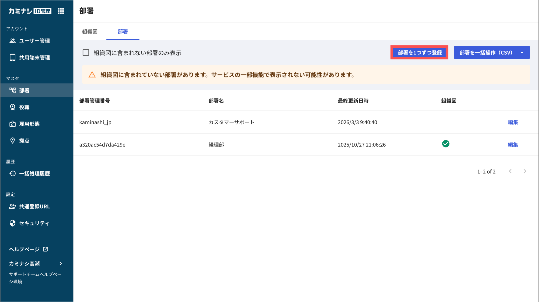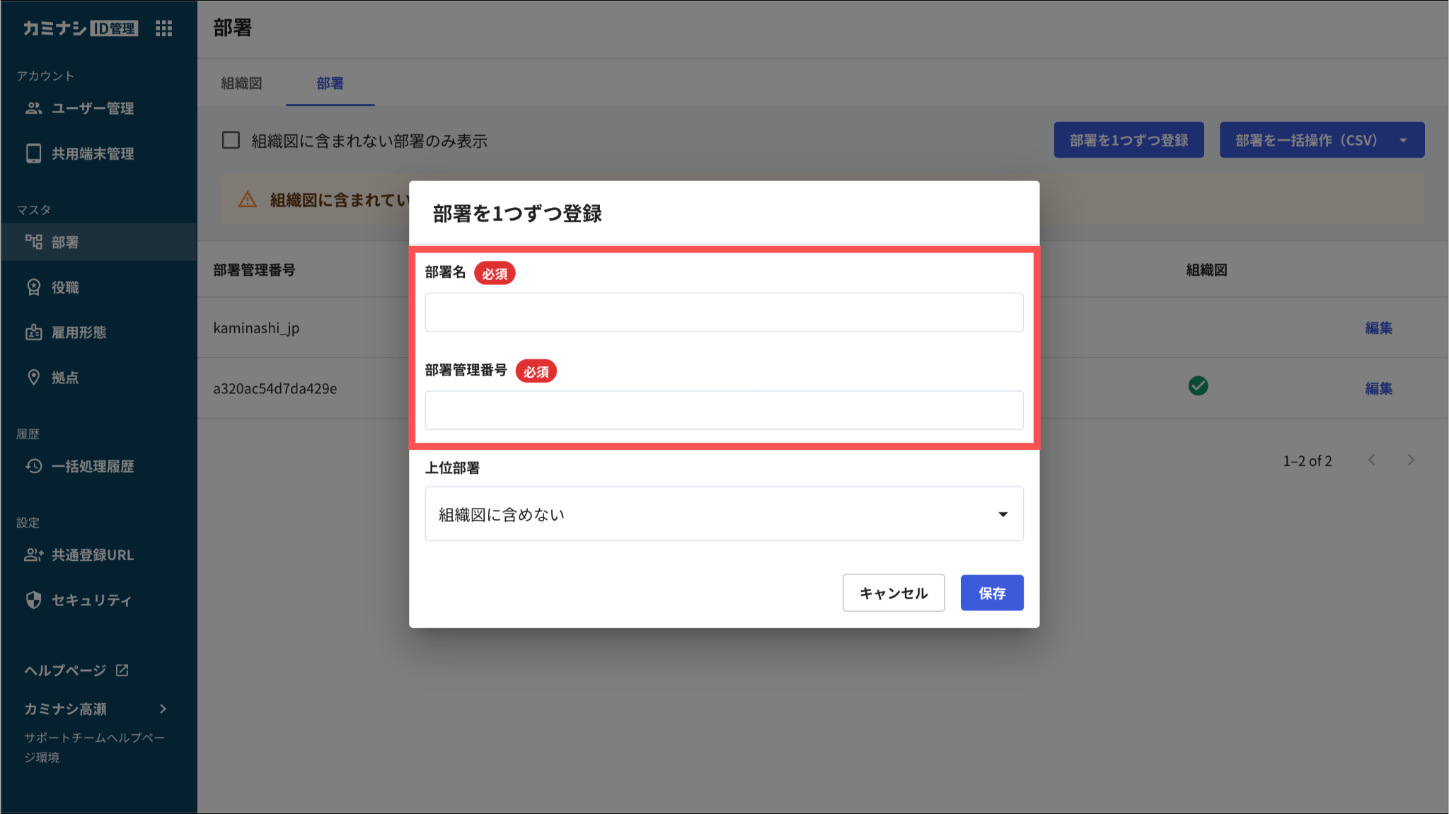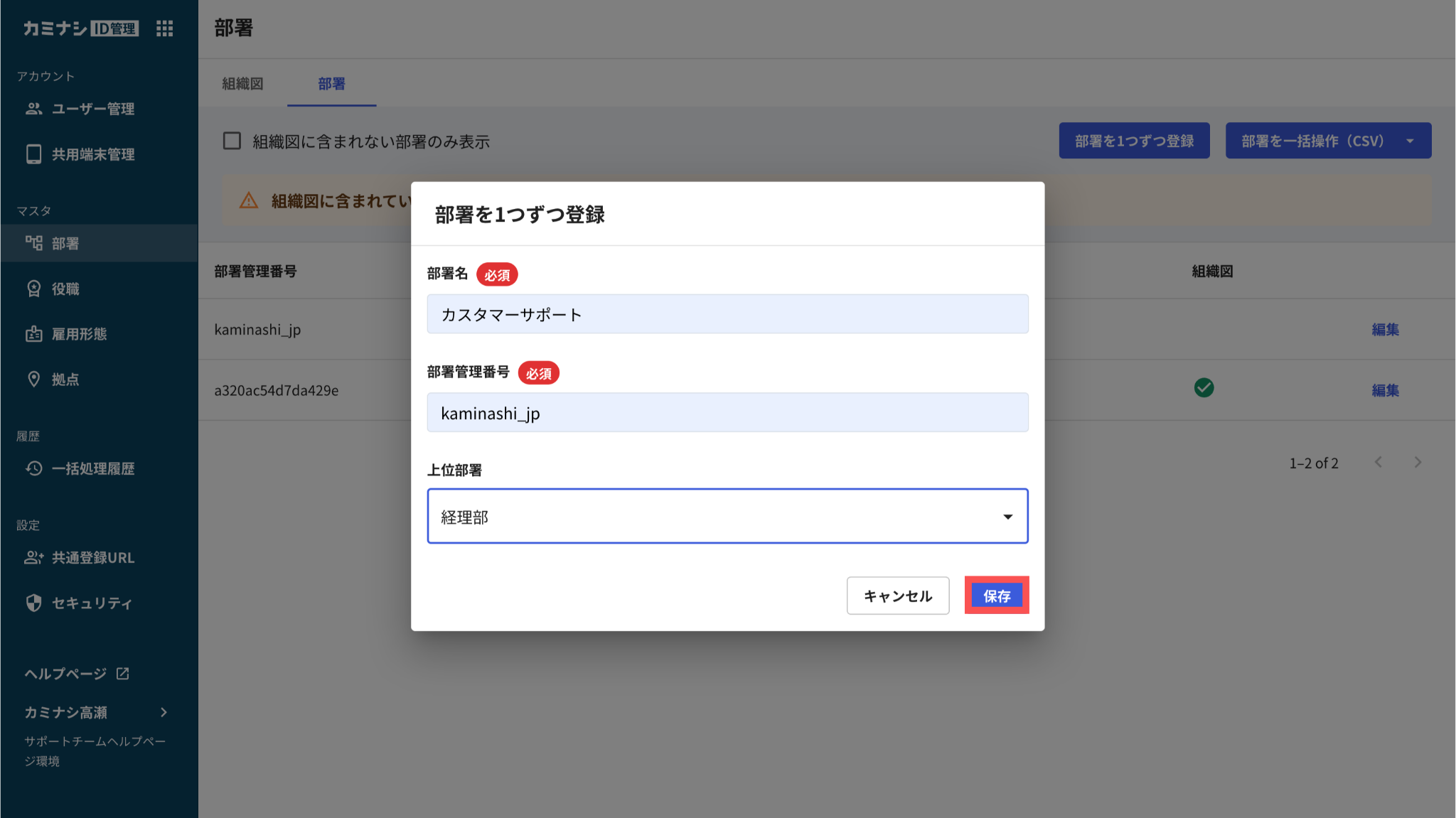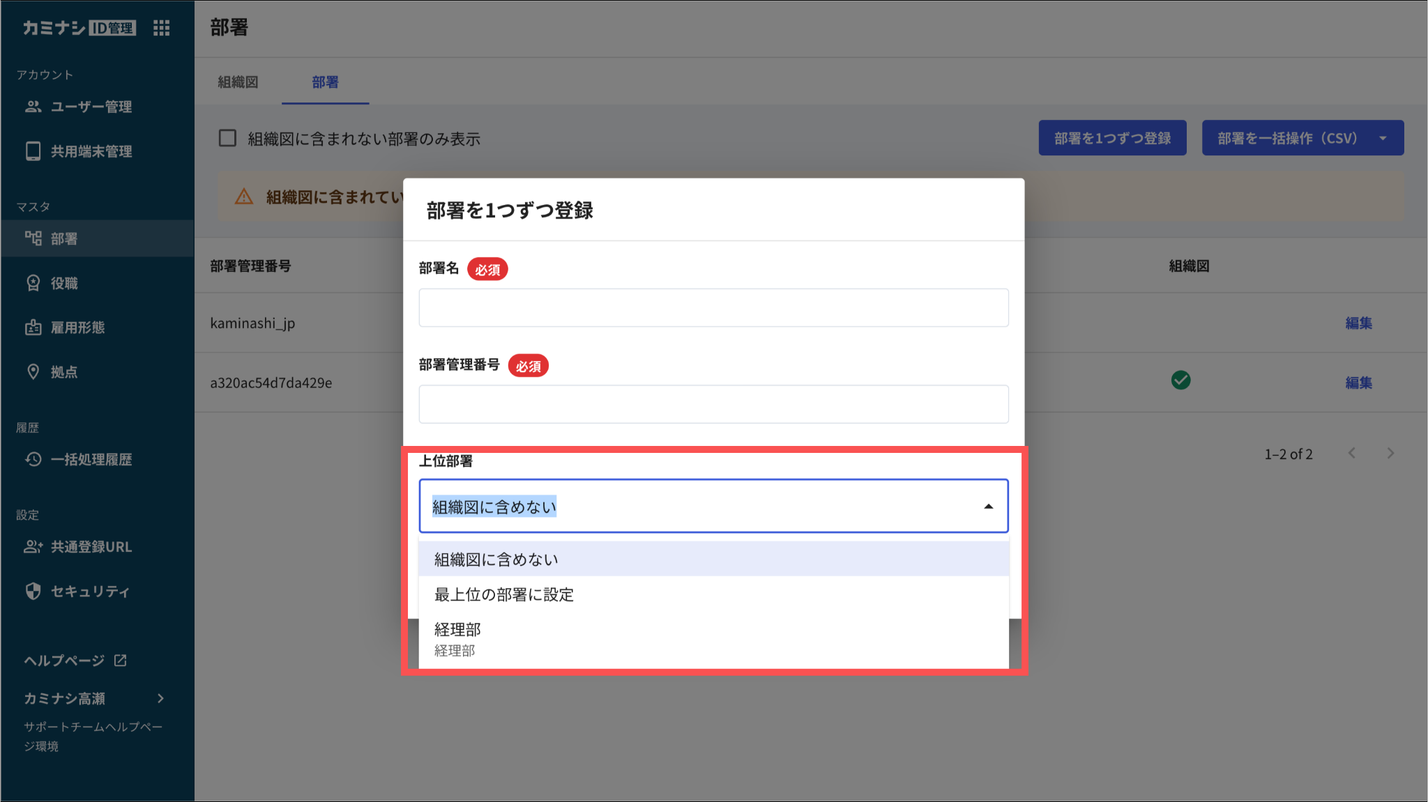 登録する部署を、組織図のどの部署の下に配置するかを選択します。