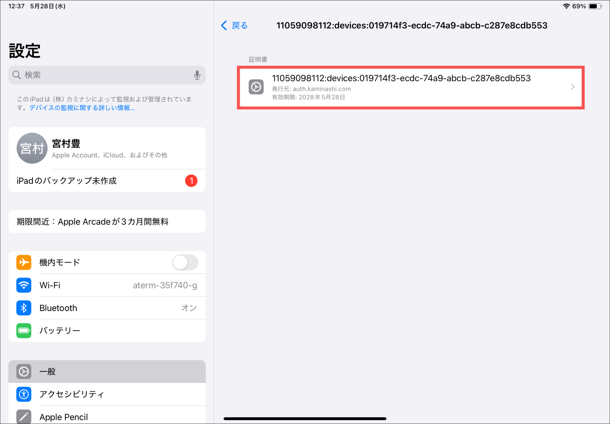 「設定アプリ>一般>VPNとデバイス管理>構成プロファイルにある証明書>詳細」の順に押すと証明書情報を確認できます。
