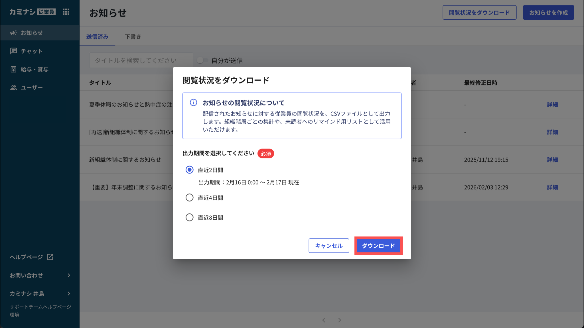 配信日が8日間より前のお知らせについては、直近で編集(配信対象者や本文の変更など)を行っていたとしても、ダウンロードの対象には含まれません。