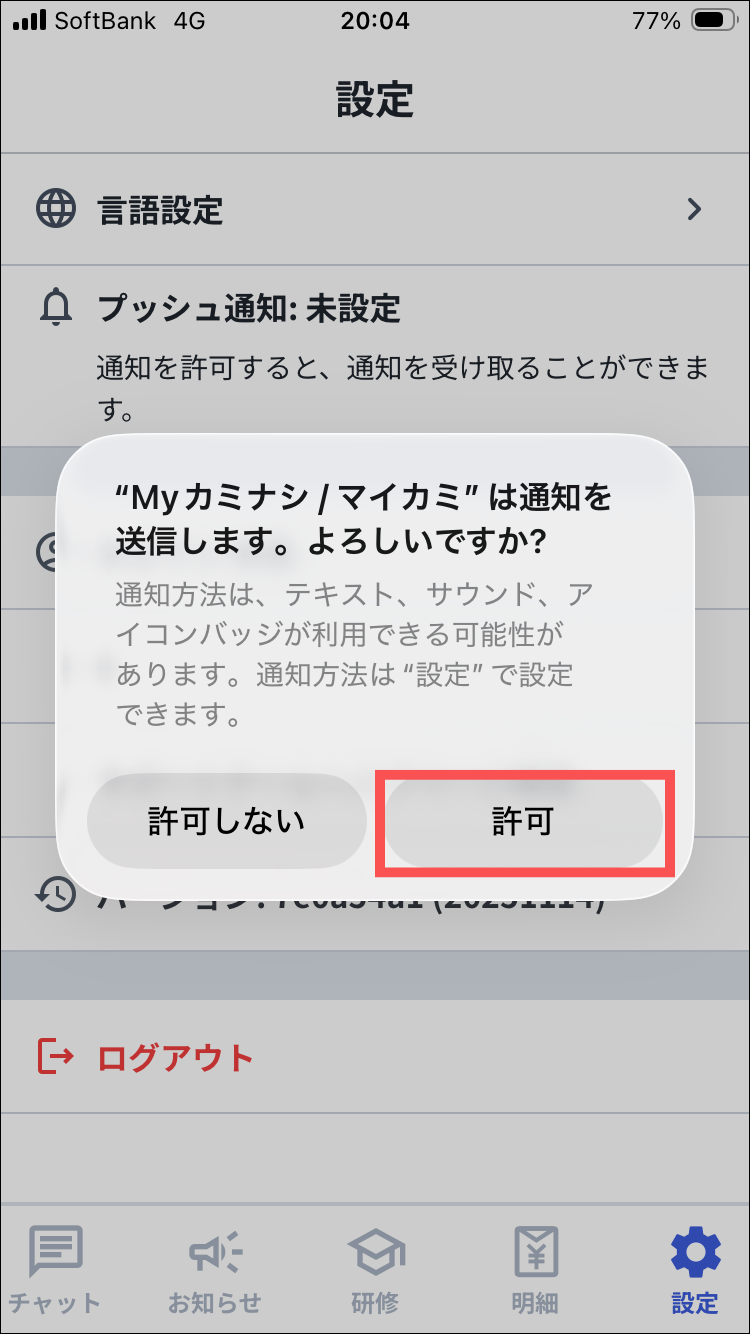プッシュ通知を設定するには、モバイル端末のホーム画面に「Myカミナシ」を追加する必要があります。