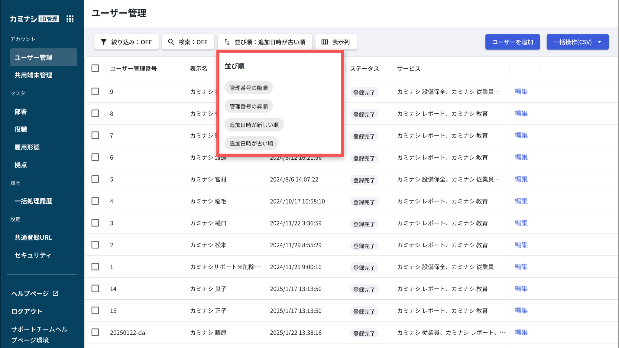 • ユーザー管理番号の昇順