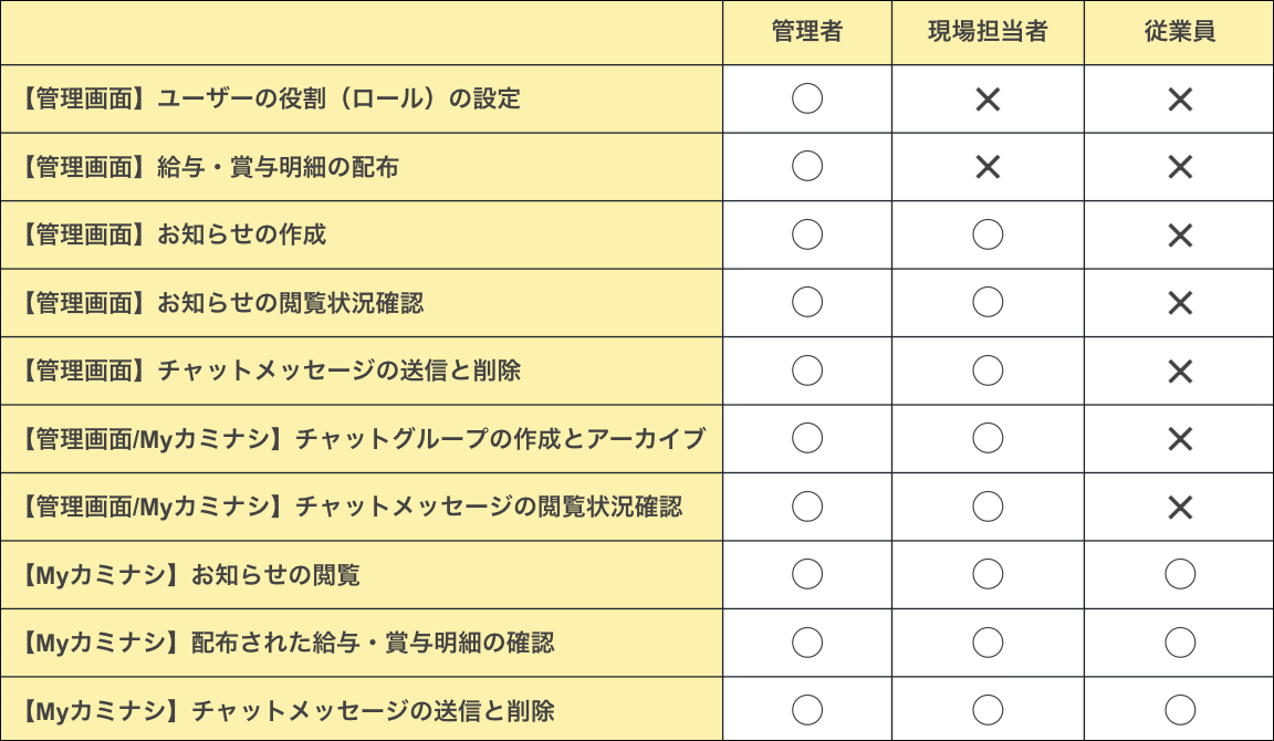 カミナシ従業員の各ロールが操作可能な範囲は以下の通りです。