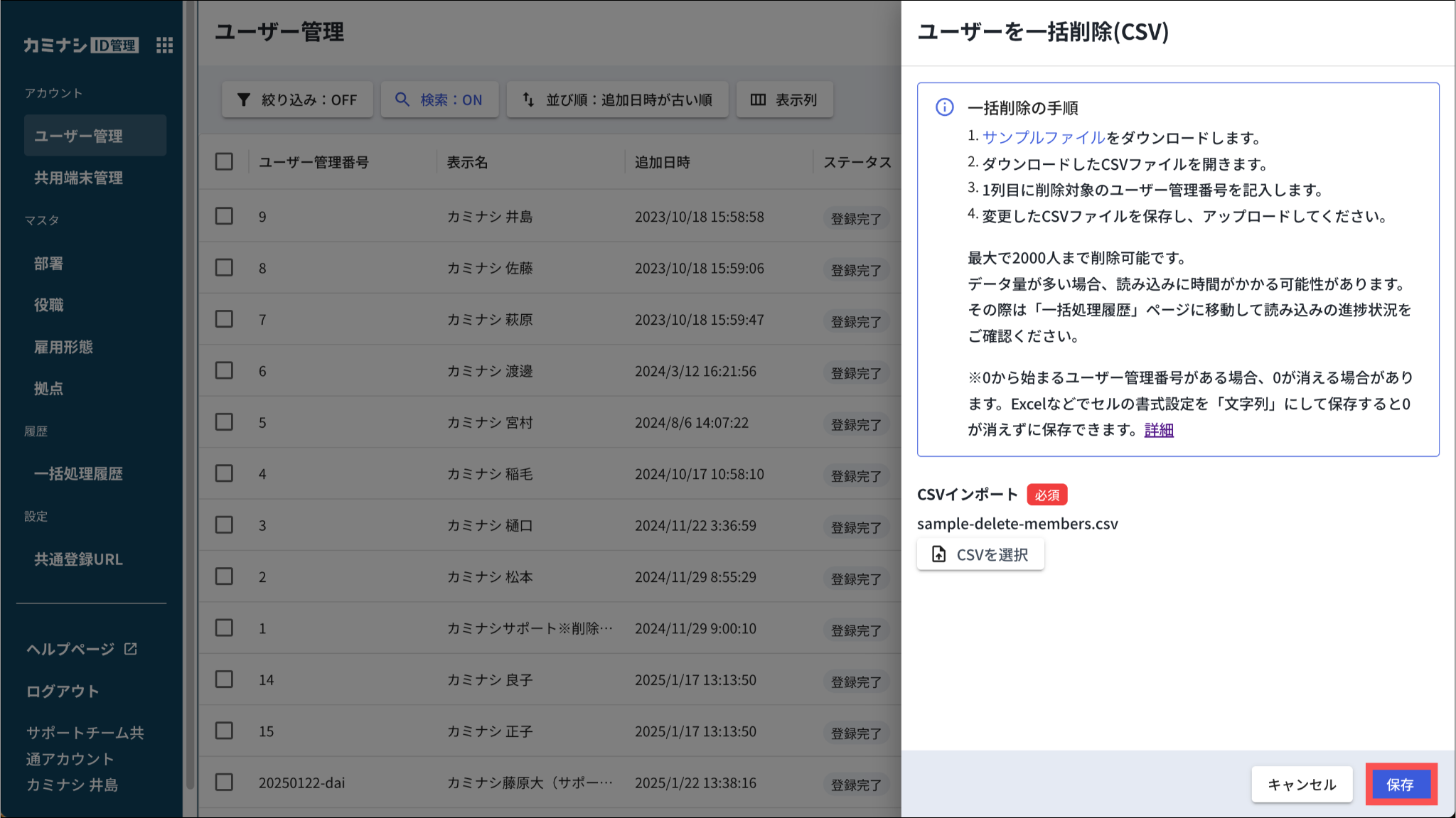 削除されたユーザーは、すぐにカミナシのサービスを利用できなくなり復元できませんのでご注意ください。