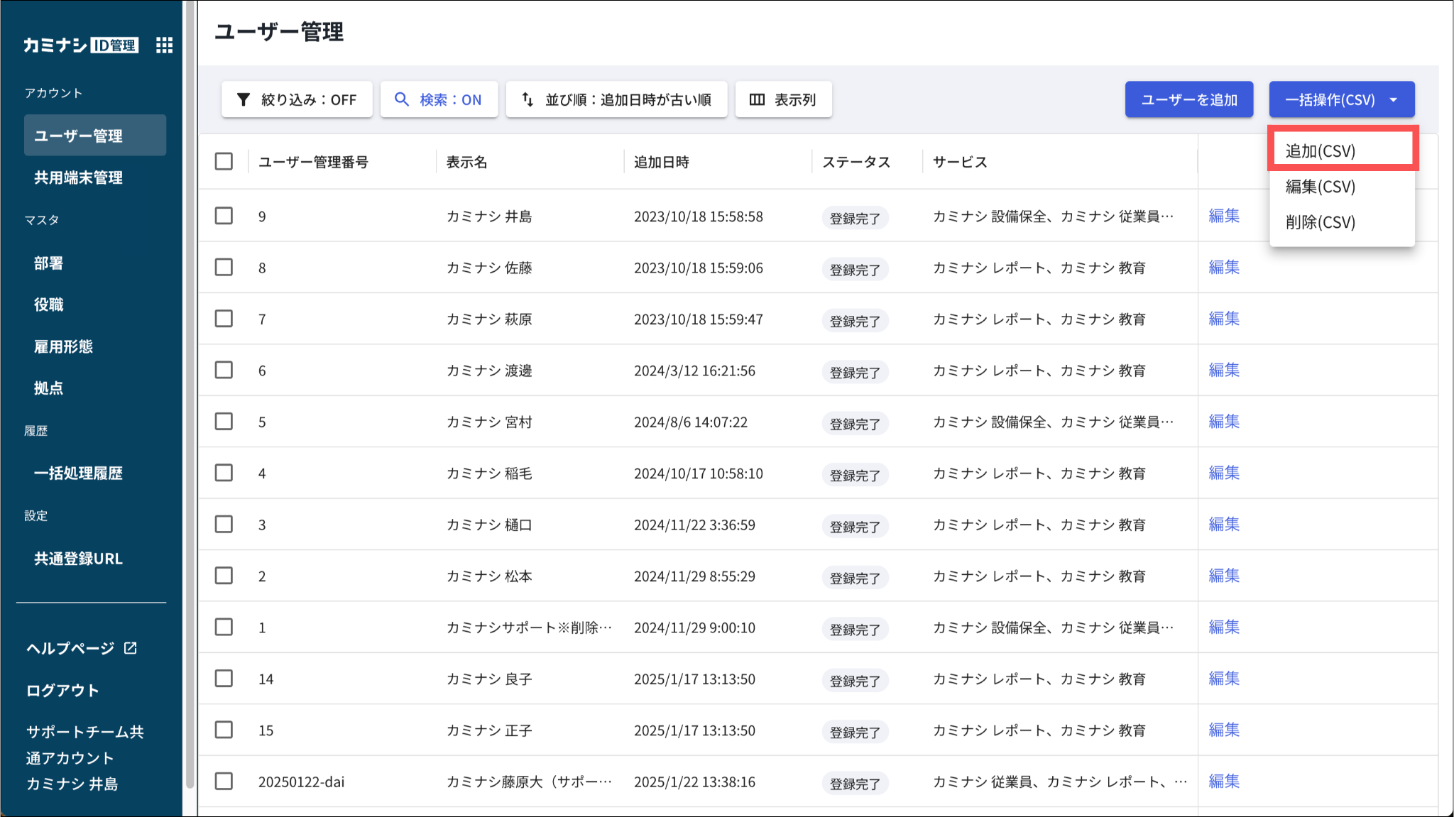 CSVファイルを使った一括登録では、主務の部署を設定することができます。