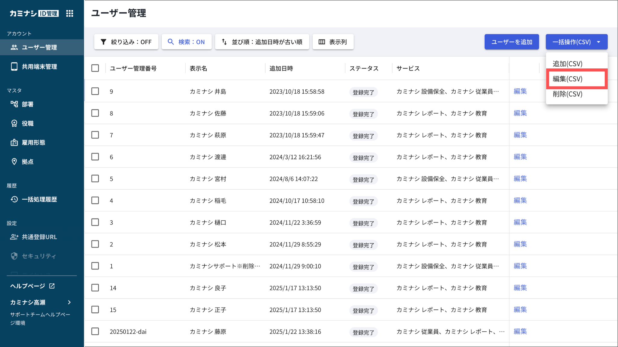 CSVファイルを使った一括編集では、ユーザー管理番号を一括で更新することはできません。