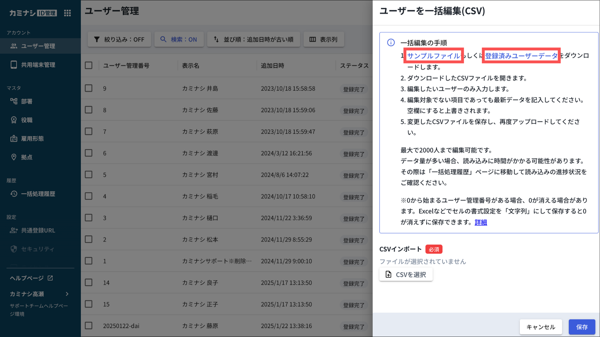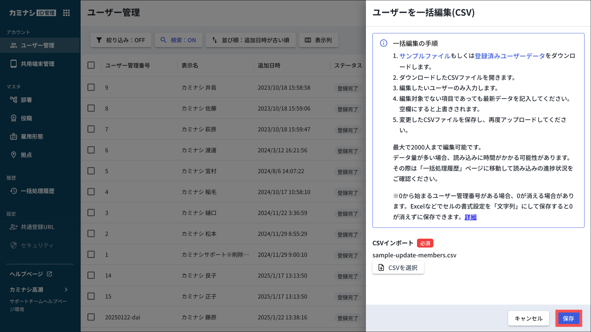 なお、本機能ではCSVファイル内の「ユーザー管理番号」を起点に、記載されているユーザー情報を一括で更新します。