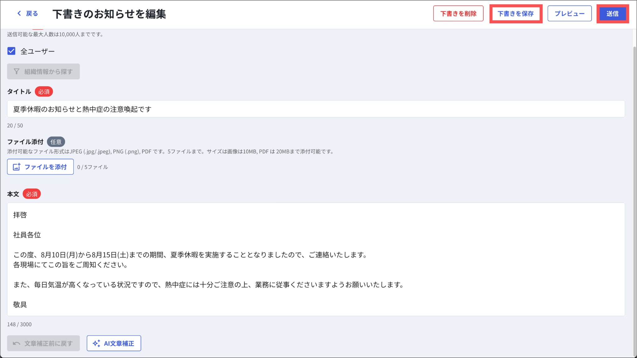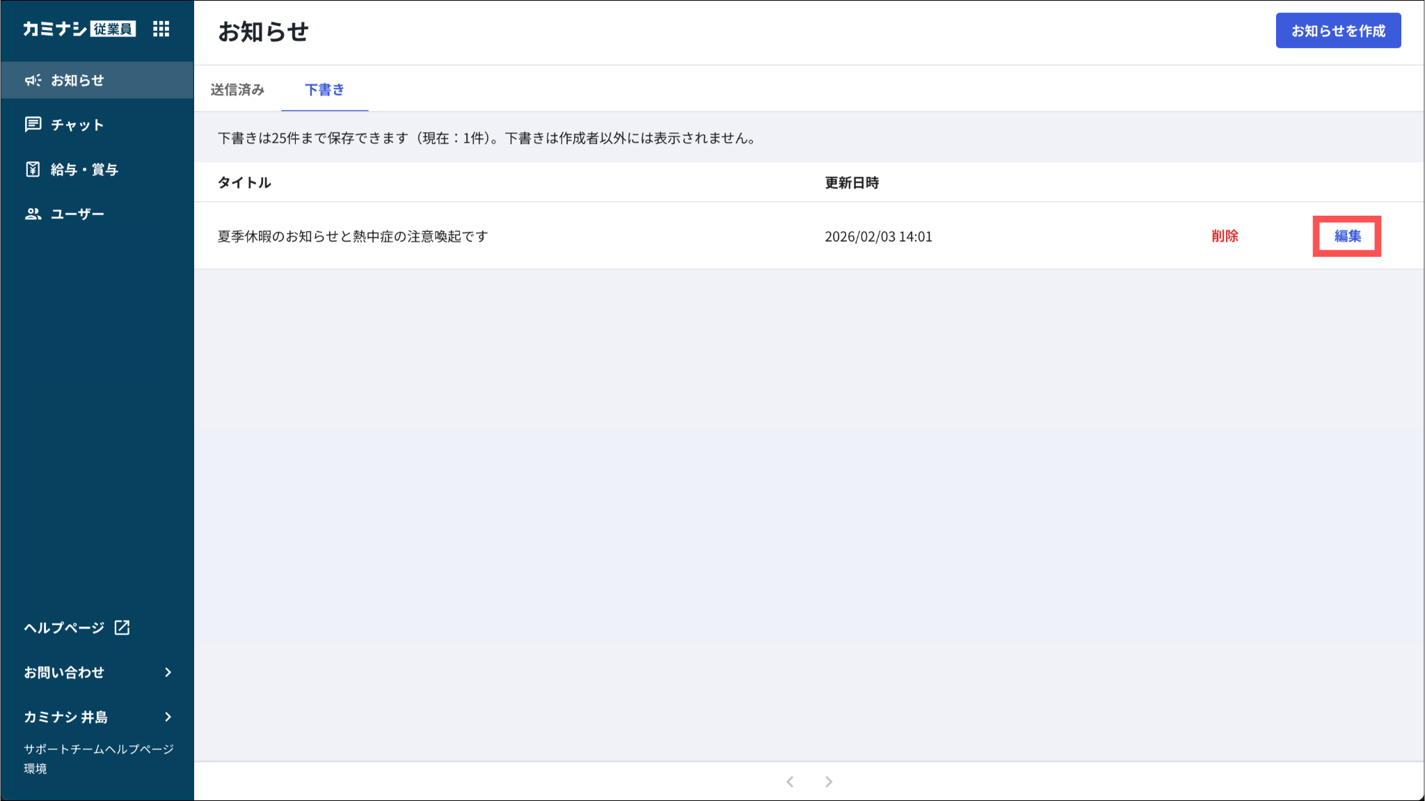 1.カミナシ従業員 管理画面にログインする2.「お知らせ」を開き、「下書き」を押す3.編集する下書きの「編集」を押す4.内容を修正し、「送信」または「下書きを保存」を押すよくある質問は、こちらからご確認ください。
