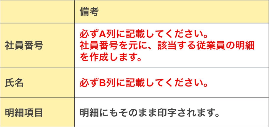 1行目に入っている明細項目(C列以降)の名称変更や列の追加・削除は貴社の給与明細項目にあわせて編集してください。