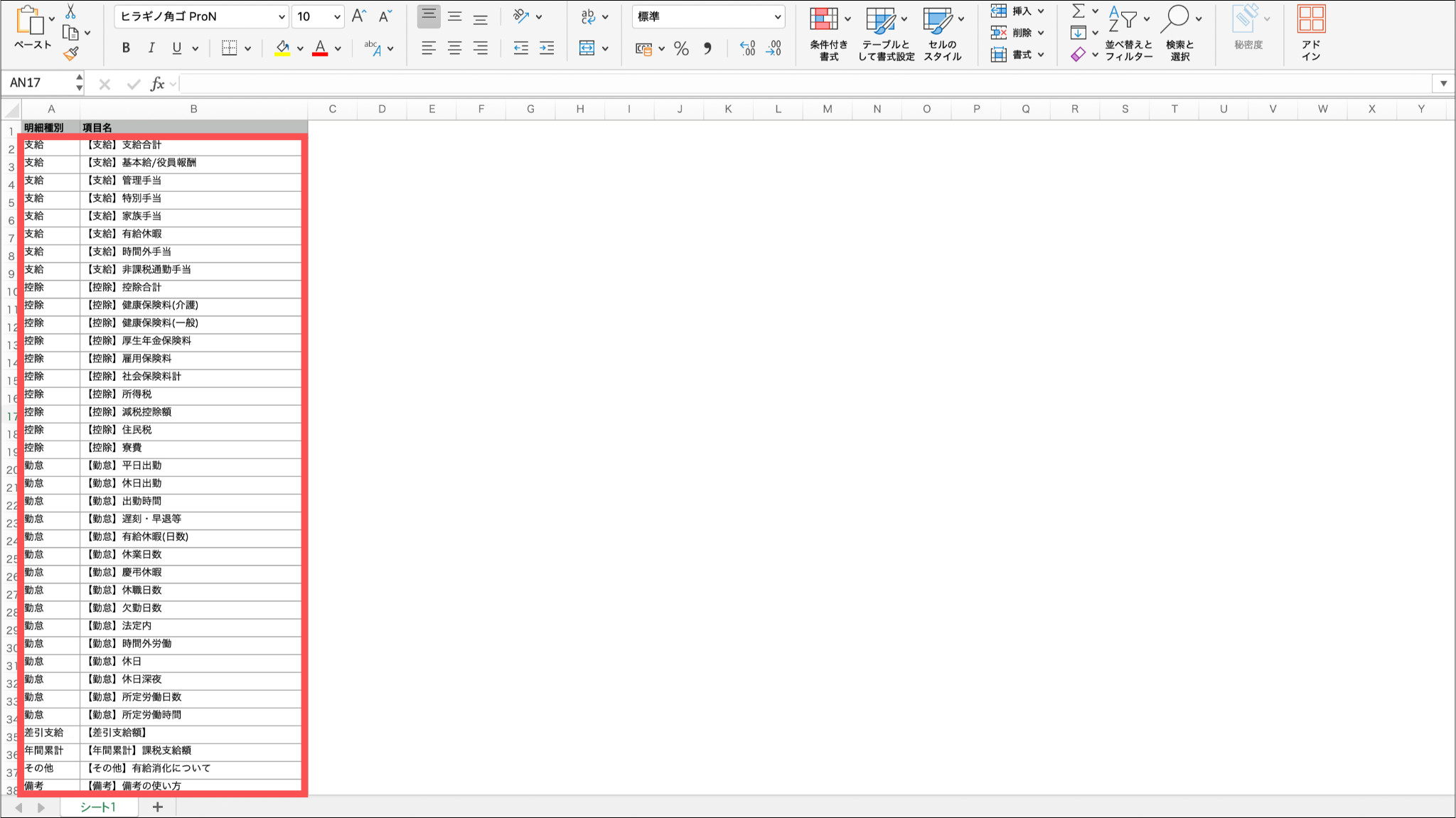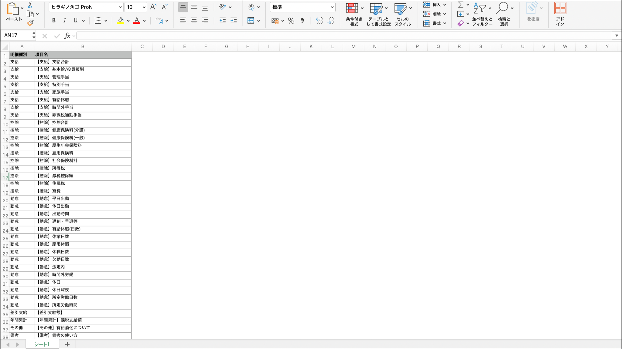 2行目以降のデータ(明細種別・項目)の追加、削除は貴社の給与明細項目にあわせて編集してください。