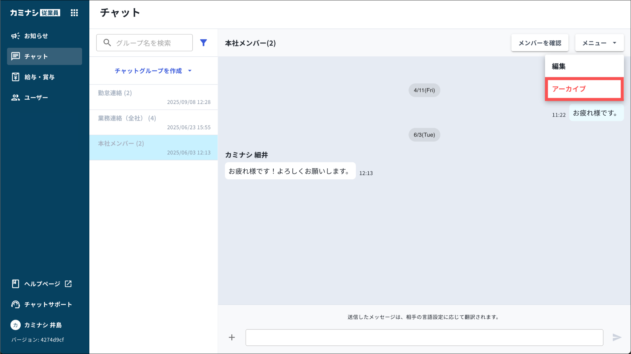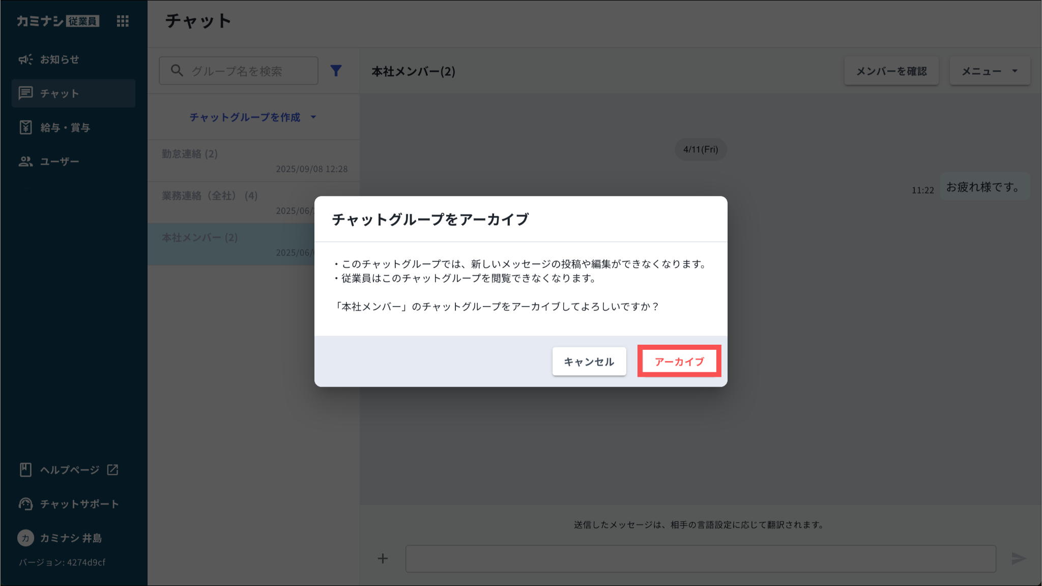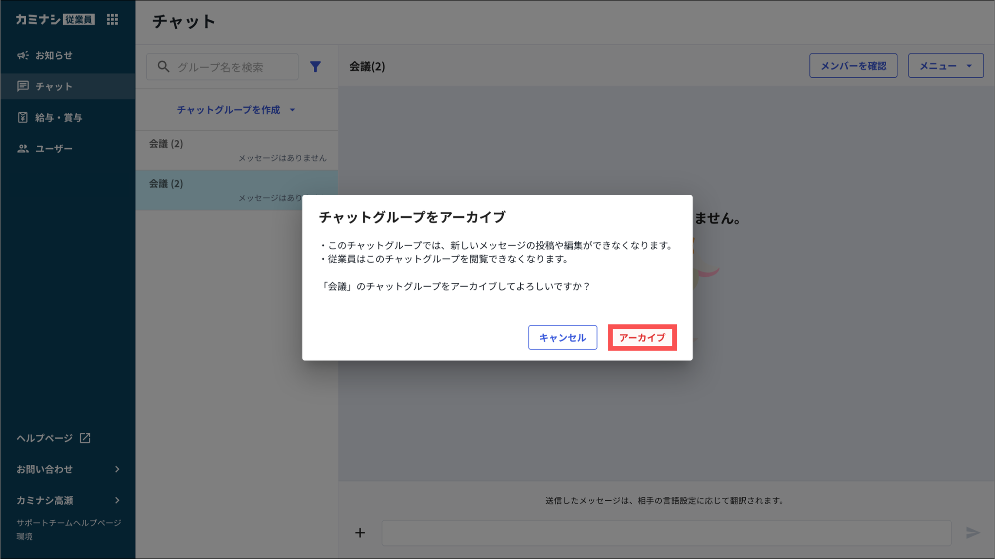 1.カミナシ従業員 管理画面にログインする2.「チャット」を開き、アーカイブするチャットグループの「メニュー」を押す3.「アーカイブ」を押す4.注意事項を確認し、「アーカイブ」を押す5.アーカイブ中のチャットグループを確認する場合は、検索窓横にあるアイコンを押し、「アーカイブ済み」を選択するよくある質問は、こちらからご確認ください。