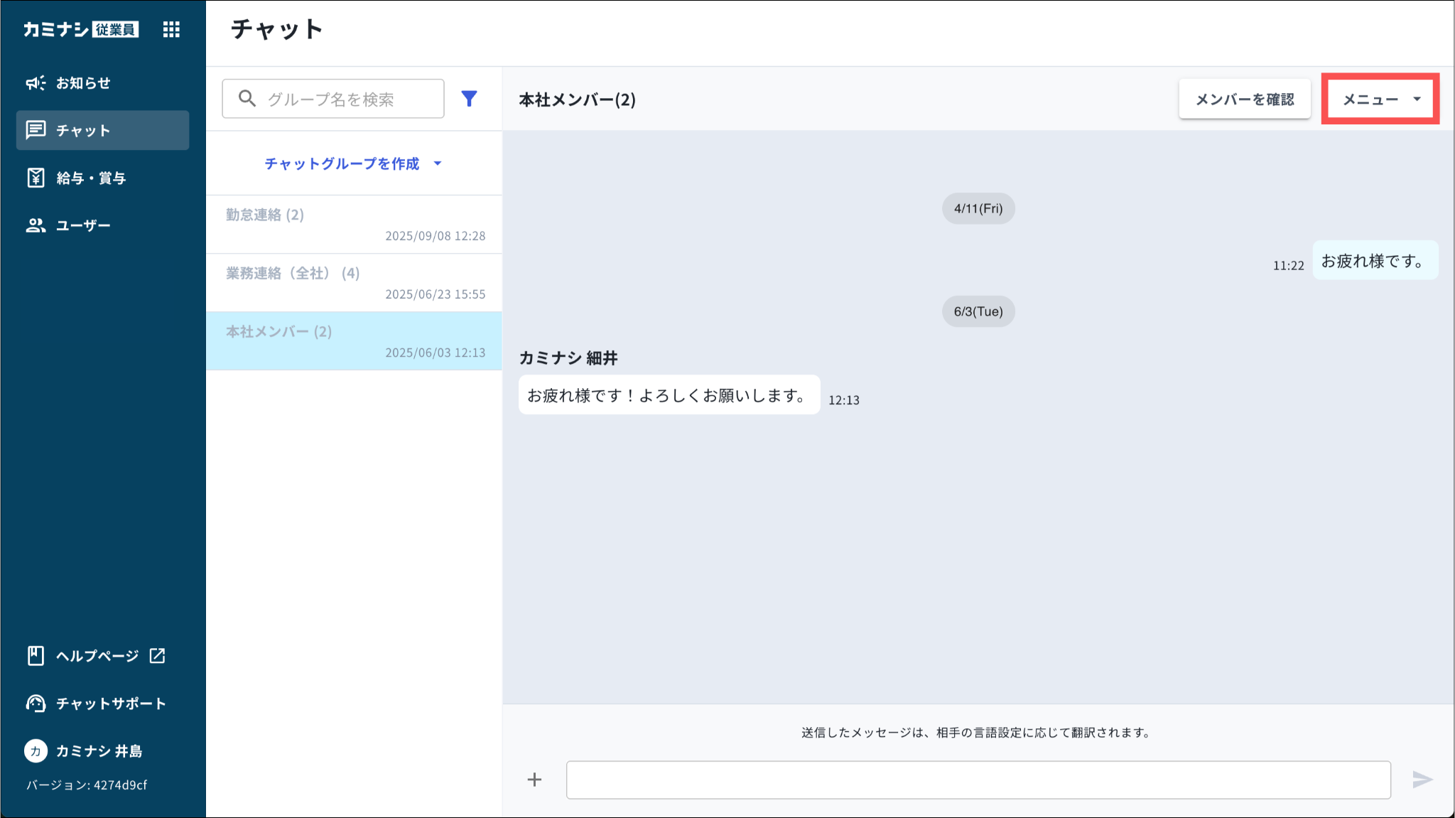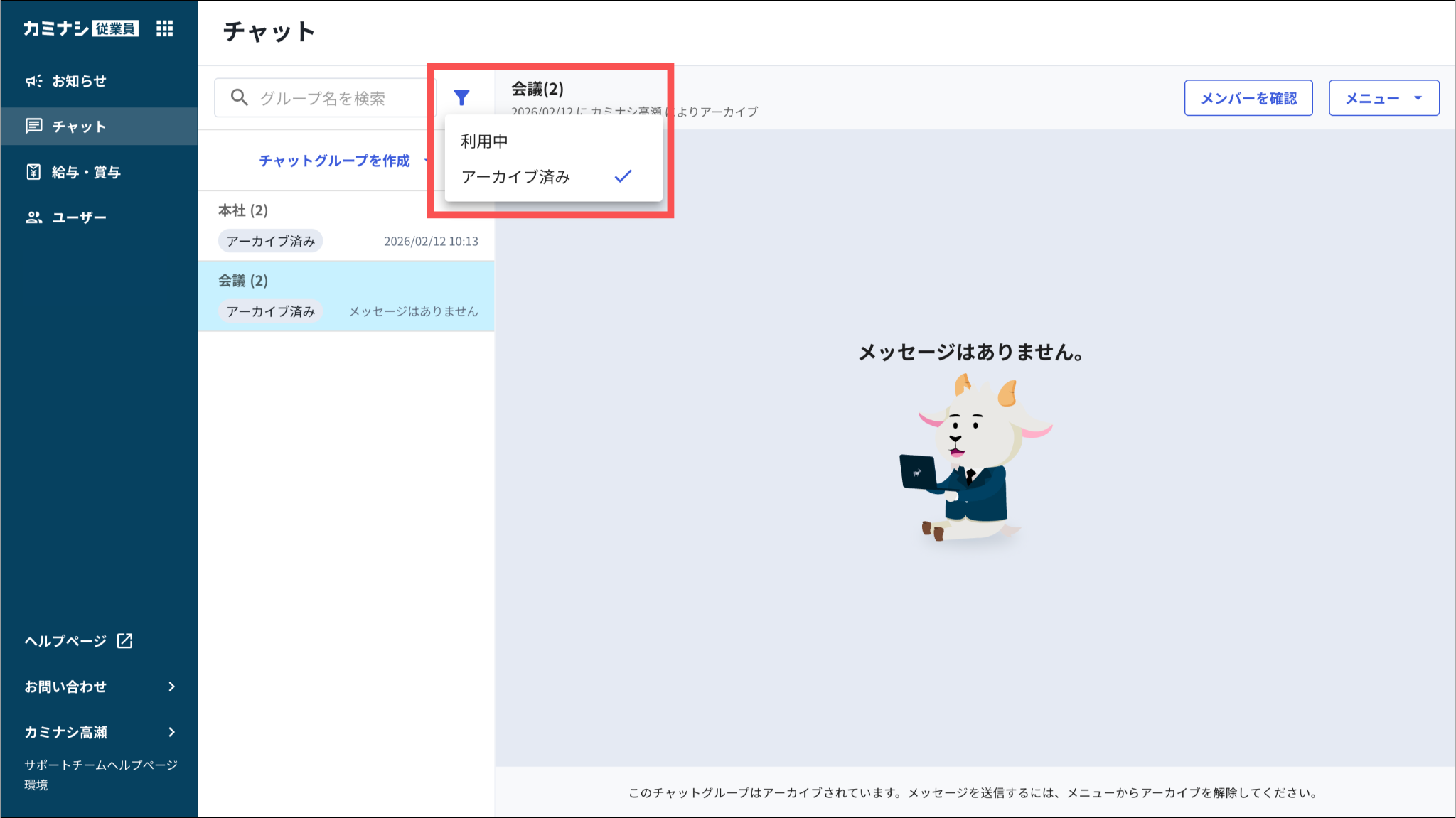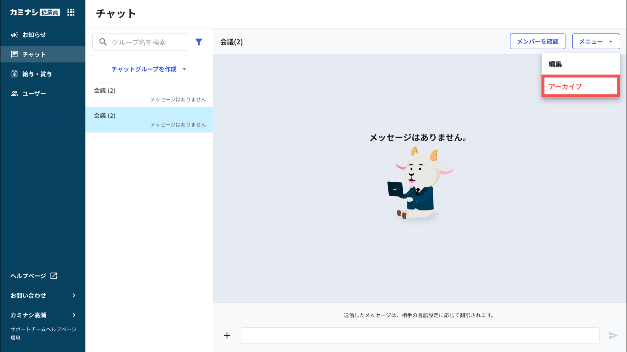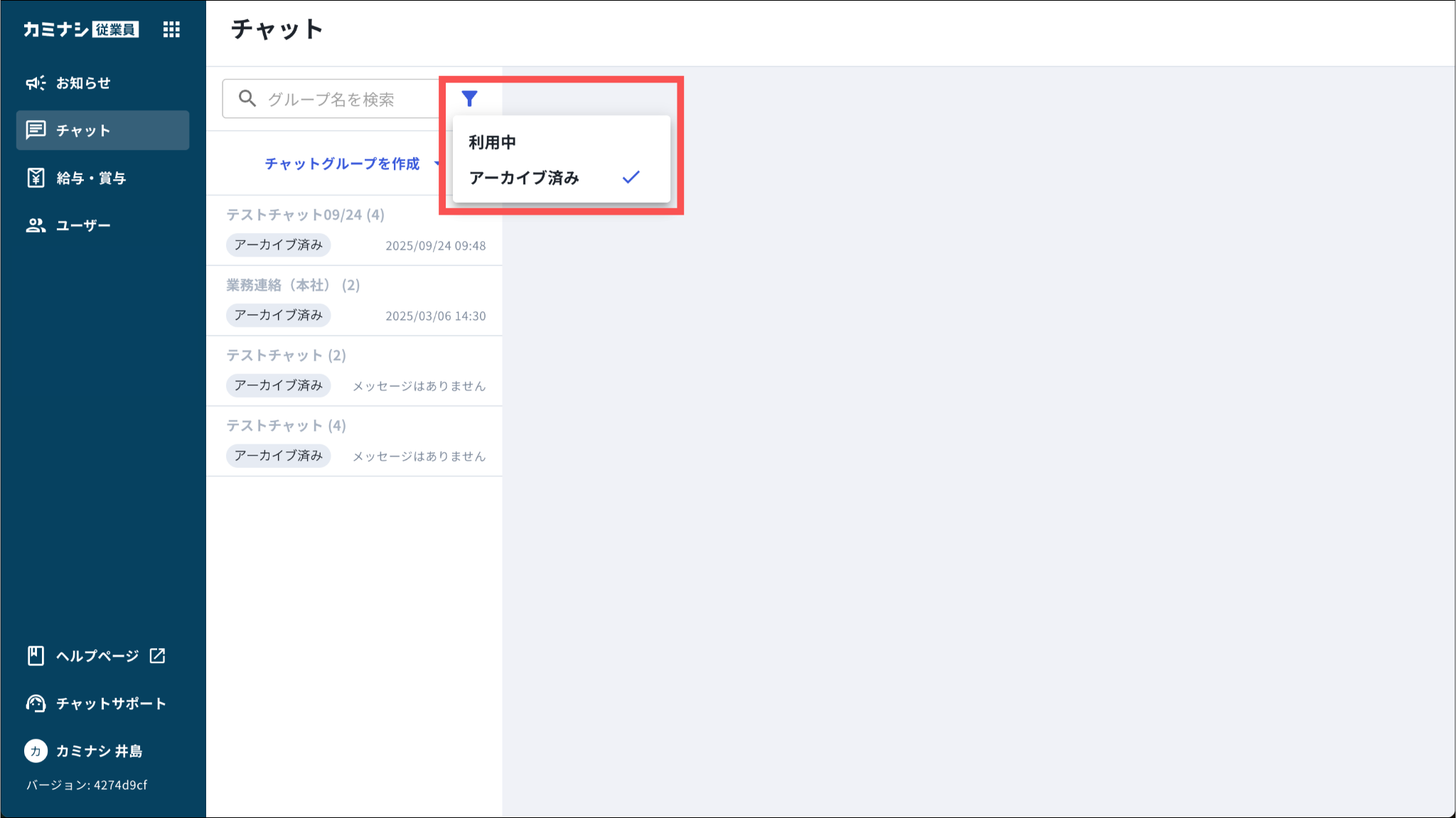 1.カミナシ従業員 管理画面にログインする2.「チャット」を開き、アーカイブするチャットグループの「メニュー」を押す3.「アーカイブ」を押す4.注意事項を確認し、「アーカイブ」を押す5.アーカイブ中のチャットグループを確認する場合は、検索窓横にあるアイコンを押し、「アーカイブ済み」を選択するよくある質問は、こちらからご確認ください。