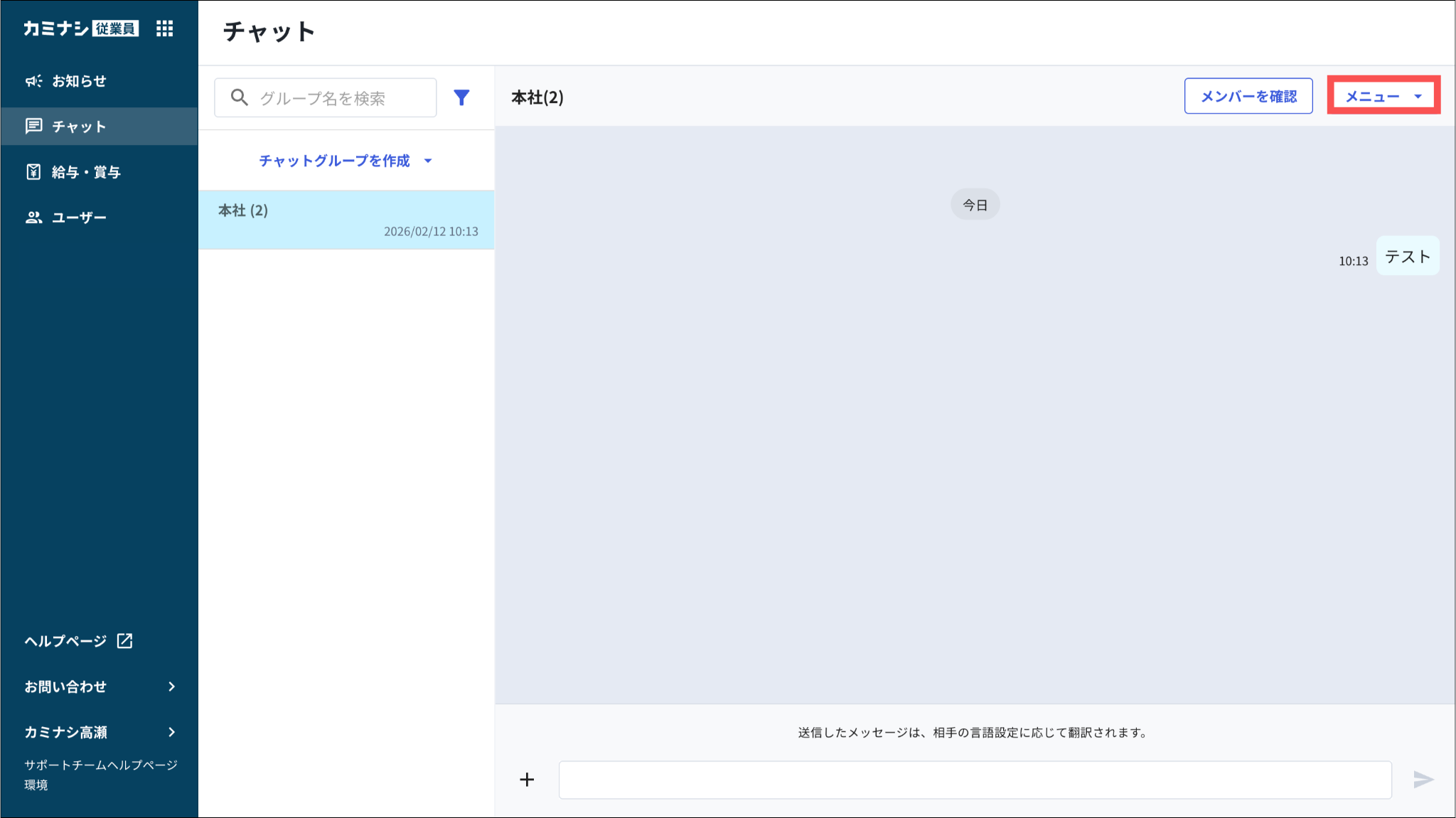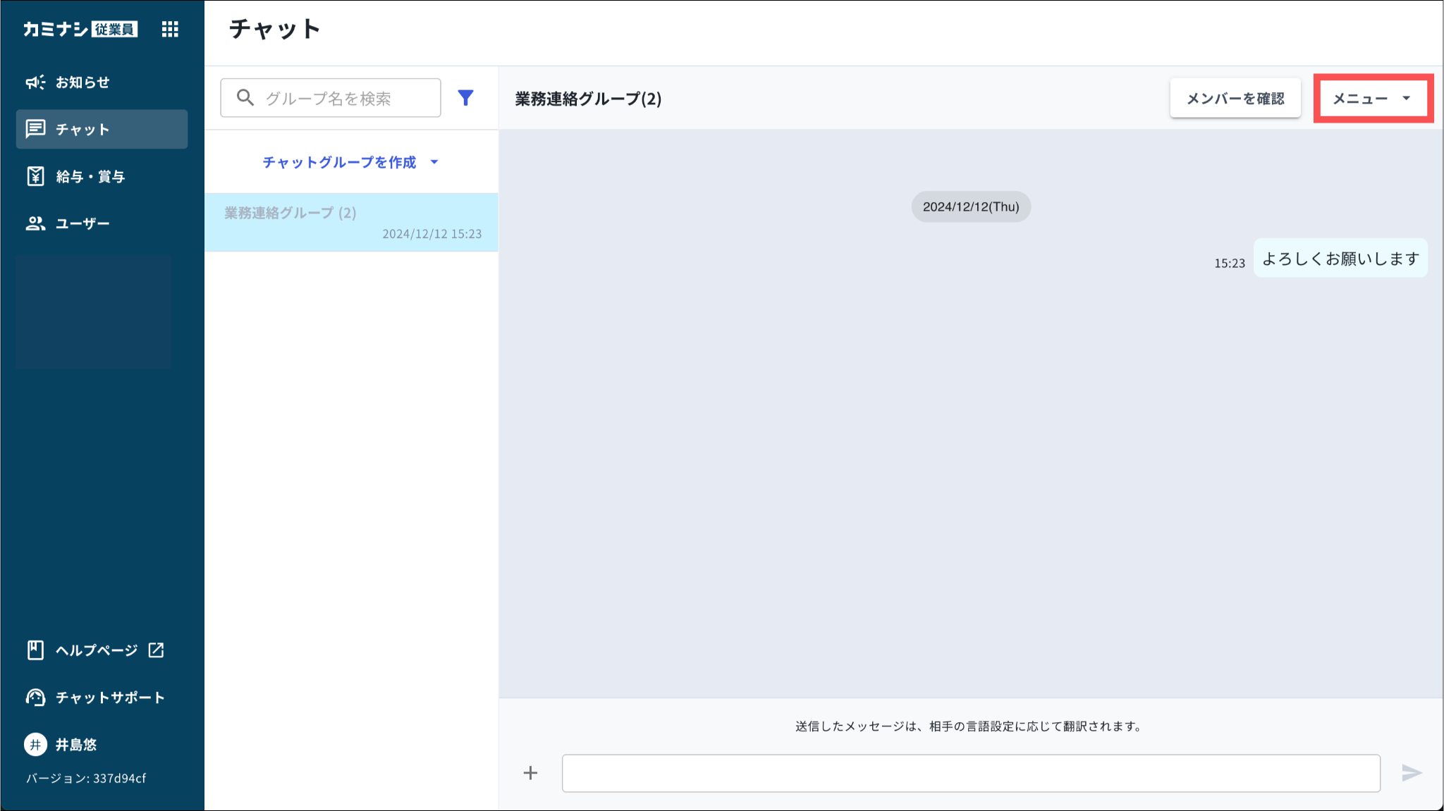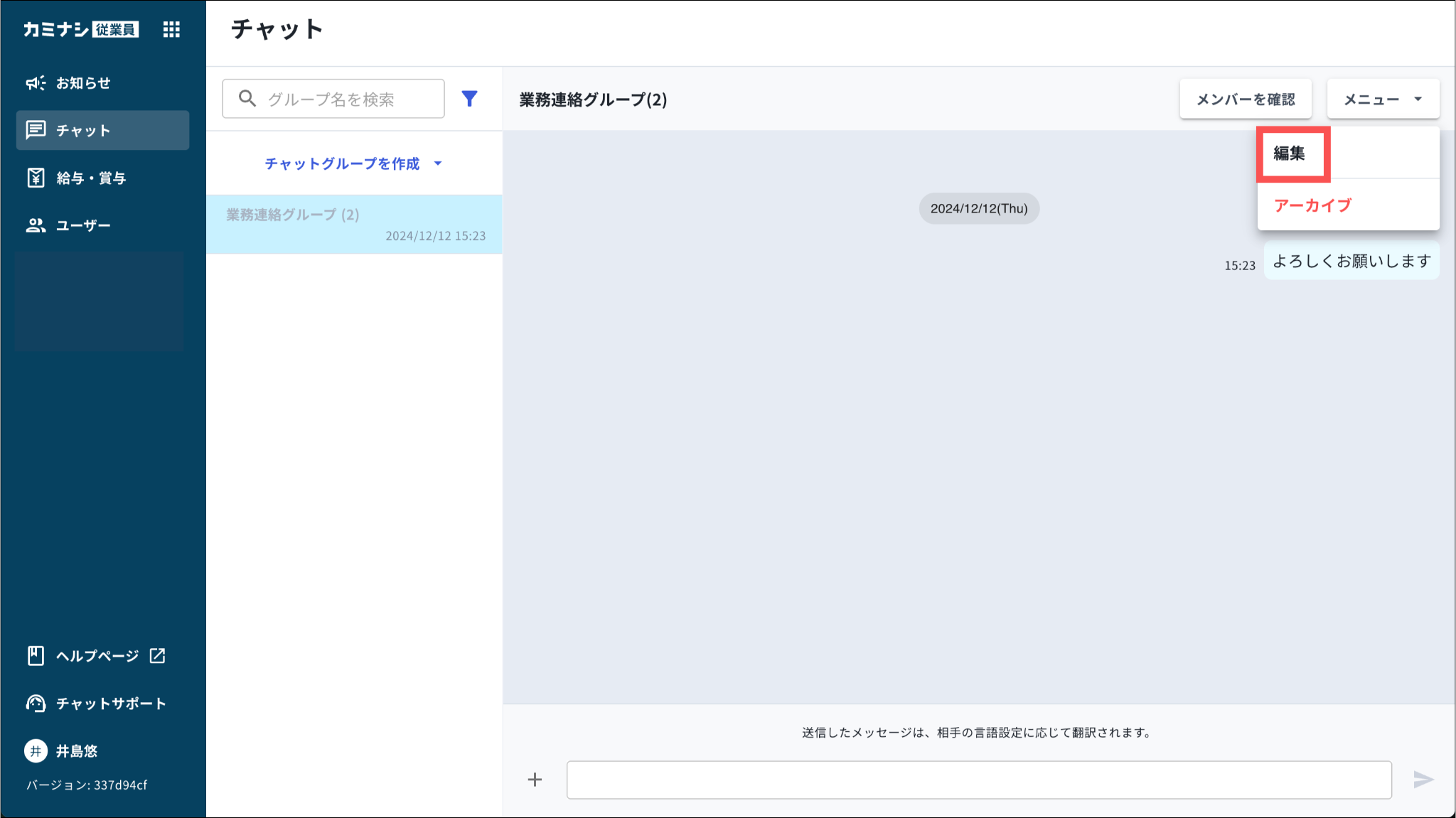1.カミナシ従業員 管理画面にログインする2.「チャット」を開き、編集するチャットグループの「メニュー」を押す3.「編集」を押す4.チャットグループ名や参加ユーザーを変更するチャットグループ名やユーザー編集については、「管理画面でチャットグループを作成する」をご参照ください。よくある質問は、こちらからご確認ください。