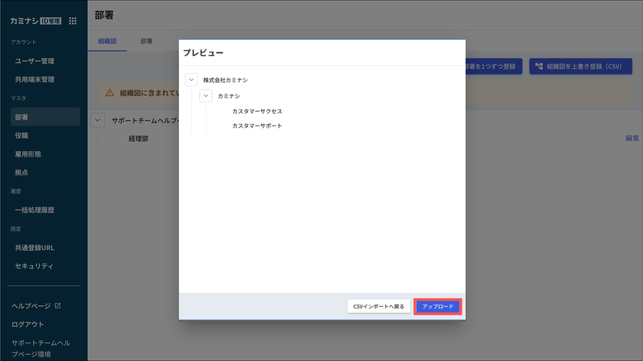 一括登録では、現在の組織図がアップロードされたデータに完全に置き換わります。