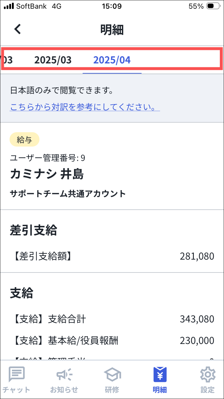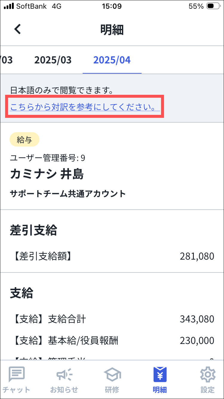 1.Myカミナシにログインする2.「明細」を開き、確認したい明細を押す3.給与額と給与の内訳を確認する「こちらから対訳を参考にしてください」を押すと、外部サイトで各項目の多言語翻訳を参照できます。4.過去の給与明細を確認する画面の上部にある年月を横にスクロールし、押すと各月の明細に切り替えることができます。よくある質問は、こちらからご確認ください。