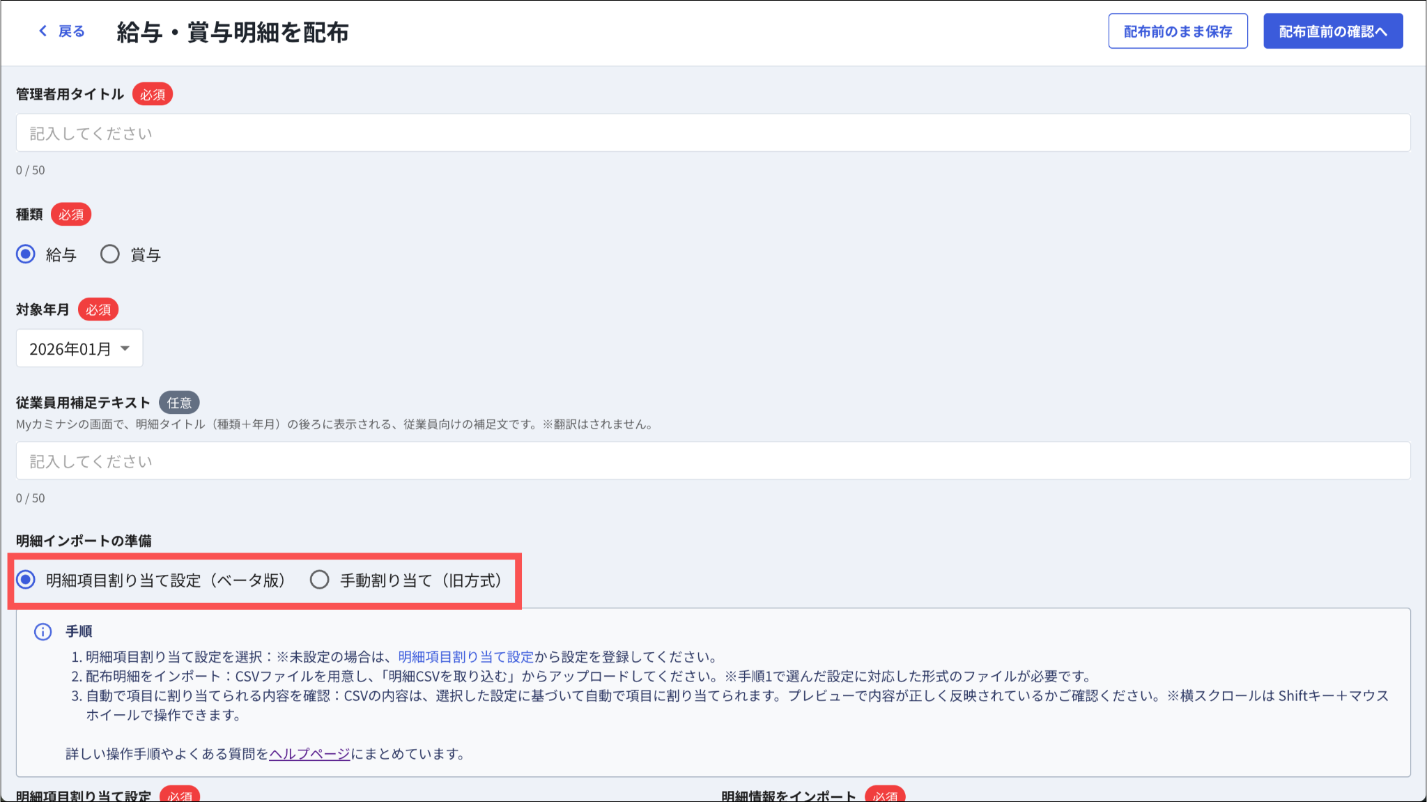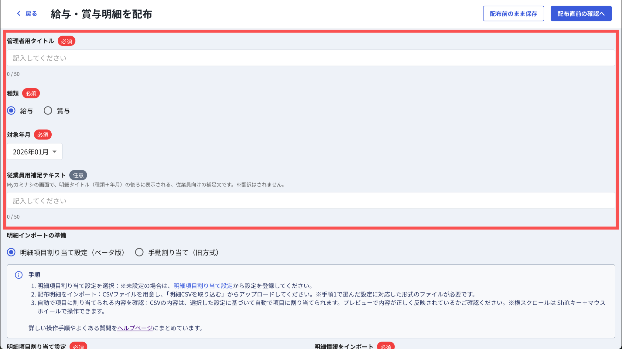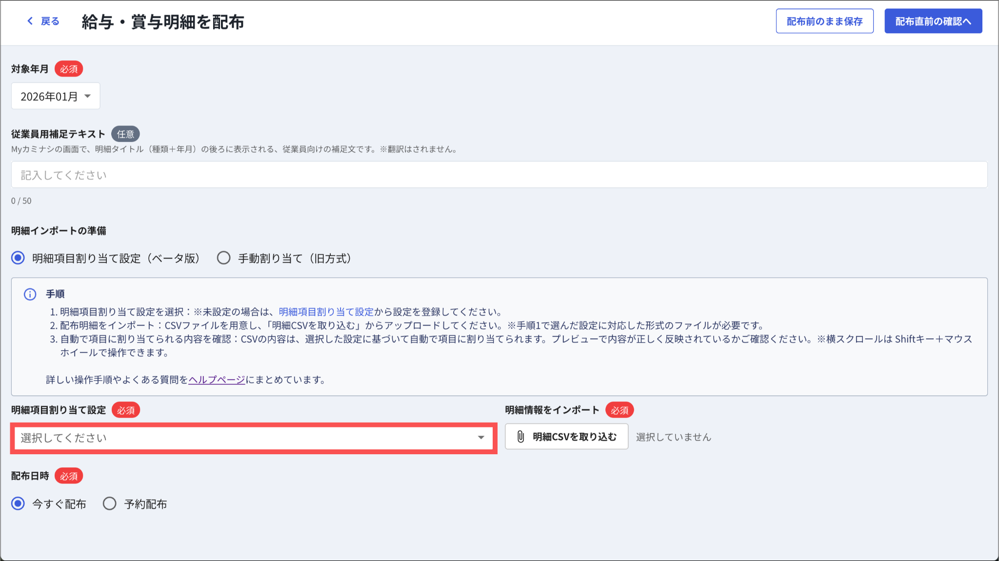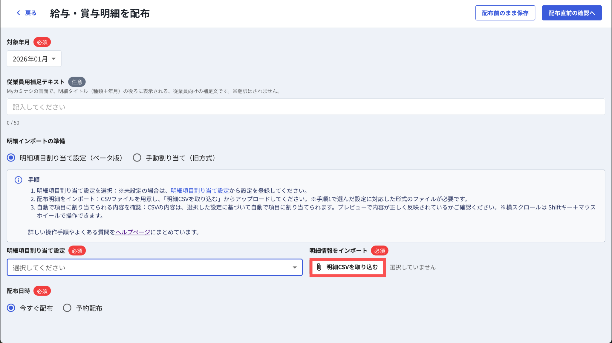明細で取り込むCSVファイルの詳細については「明細配布用のCSVファイルを用意する」をご参照ください。