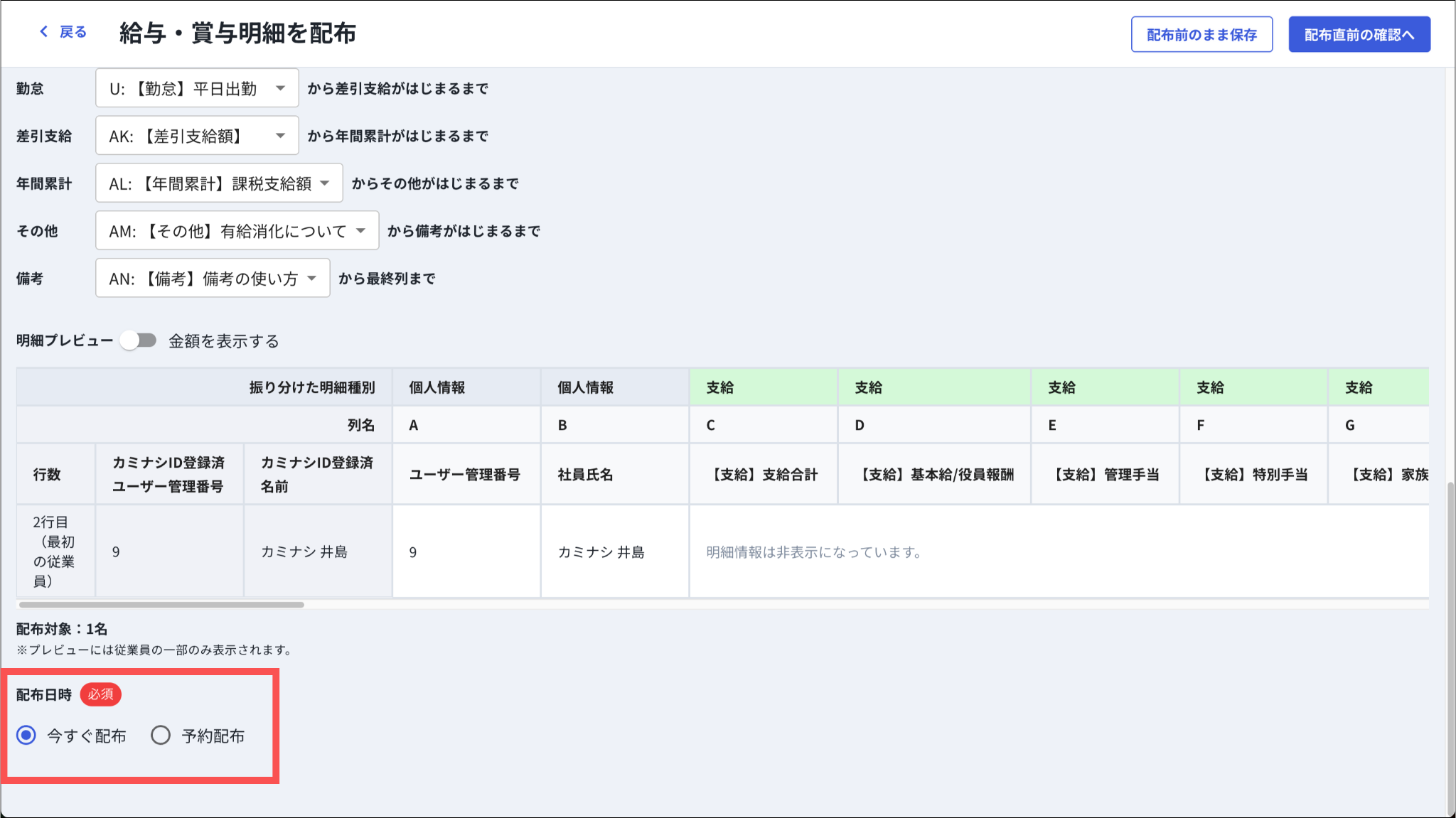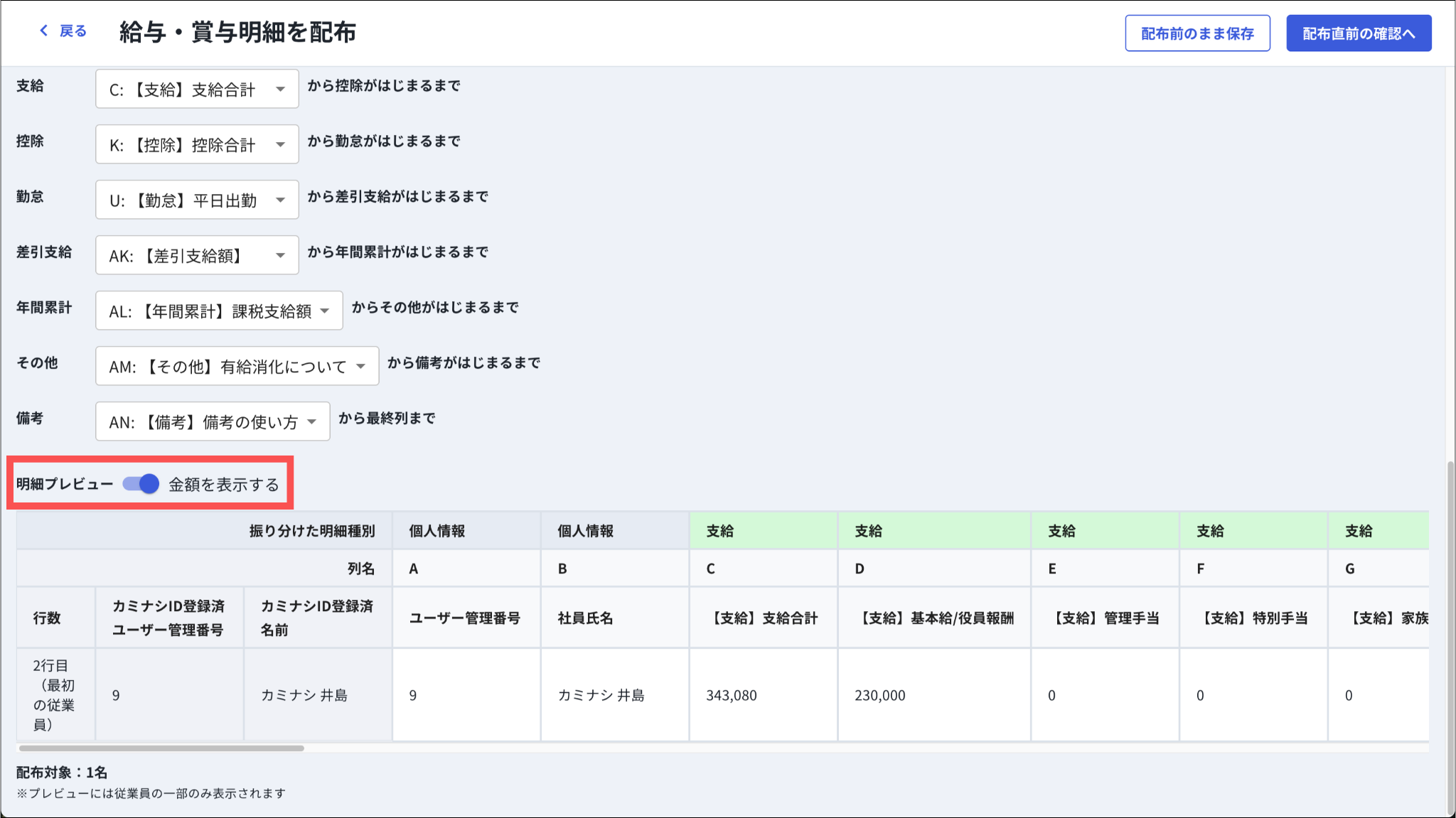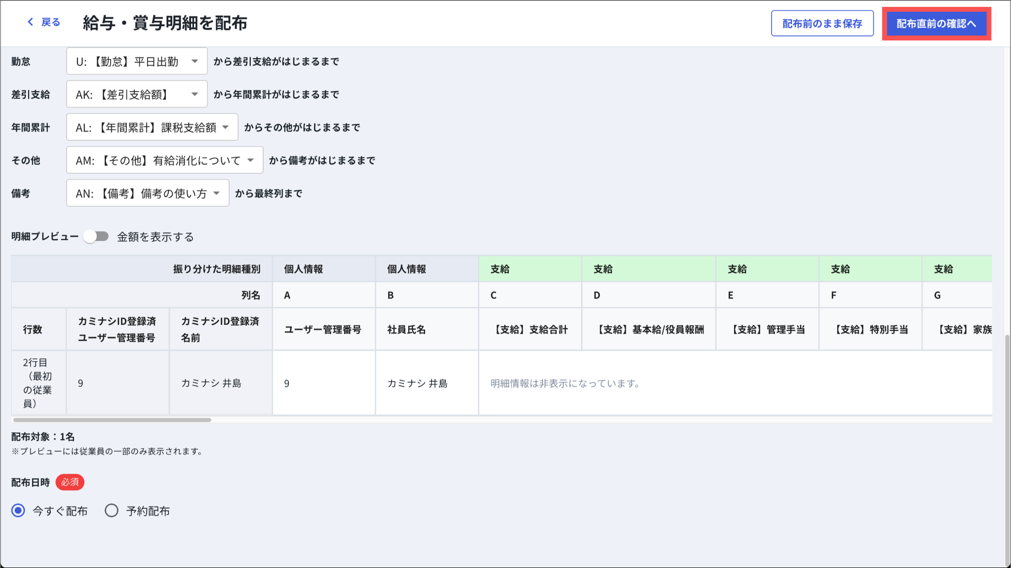 給与明細種別(支給/控除/勤怠/差引支給/年間累計/その他/備考)と明細項目を紐付けるために、各明細種別に対象列を指定します