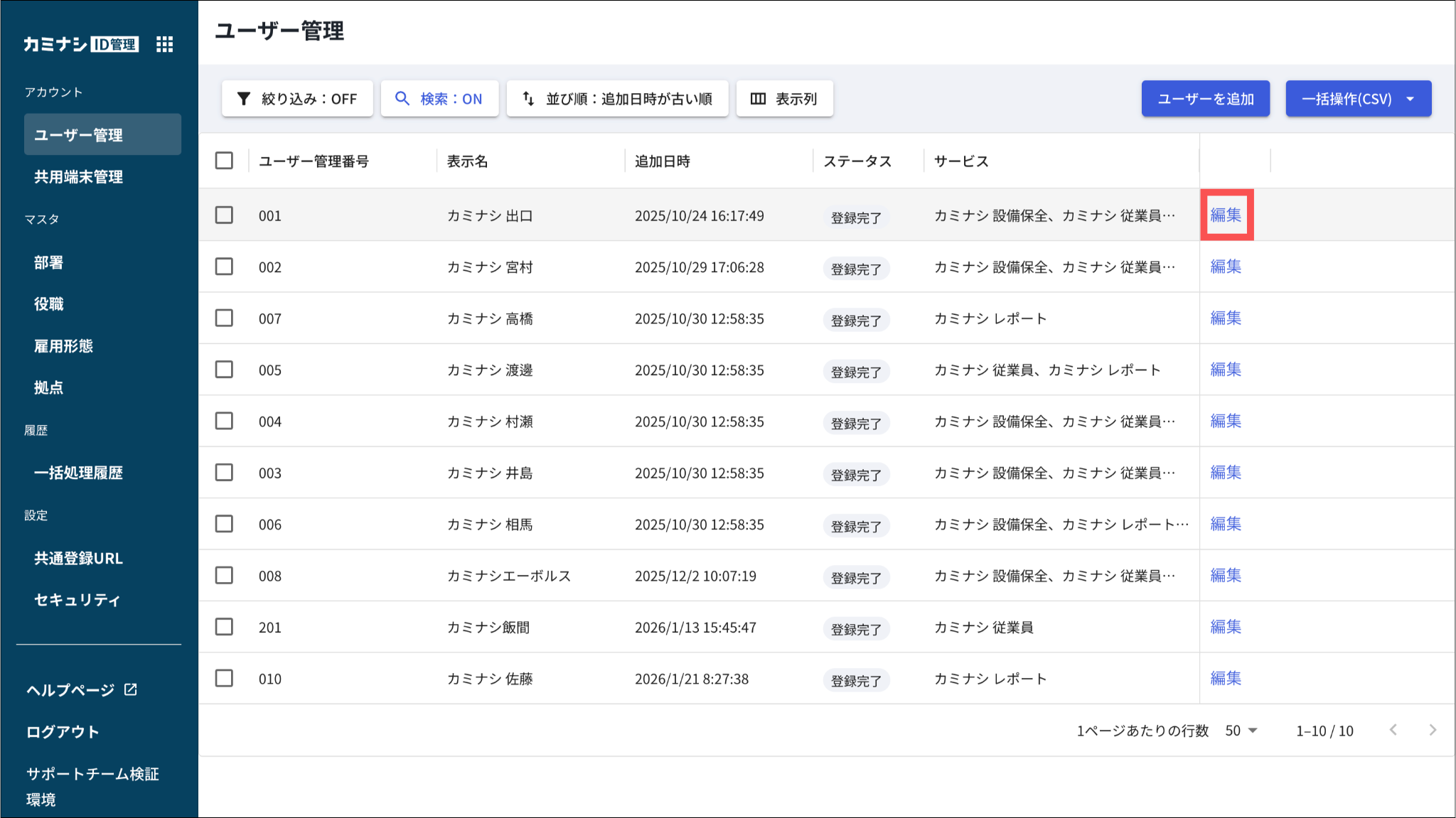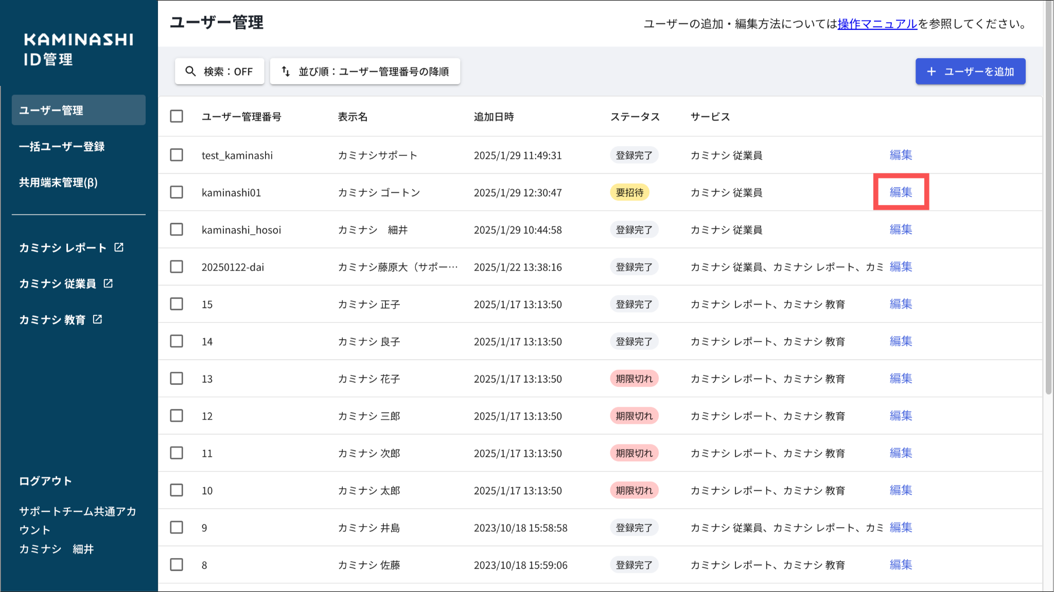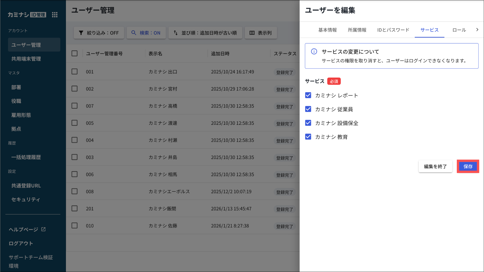 すでに他サービスで登録済みのユーザーがいる場合、新たに「カミナシ従業員」を利用できるようにするには、そのユーザーに「カミナシ従業員」のサービス利用権限を付与する必要があります。