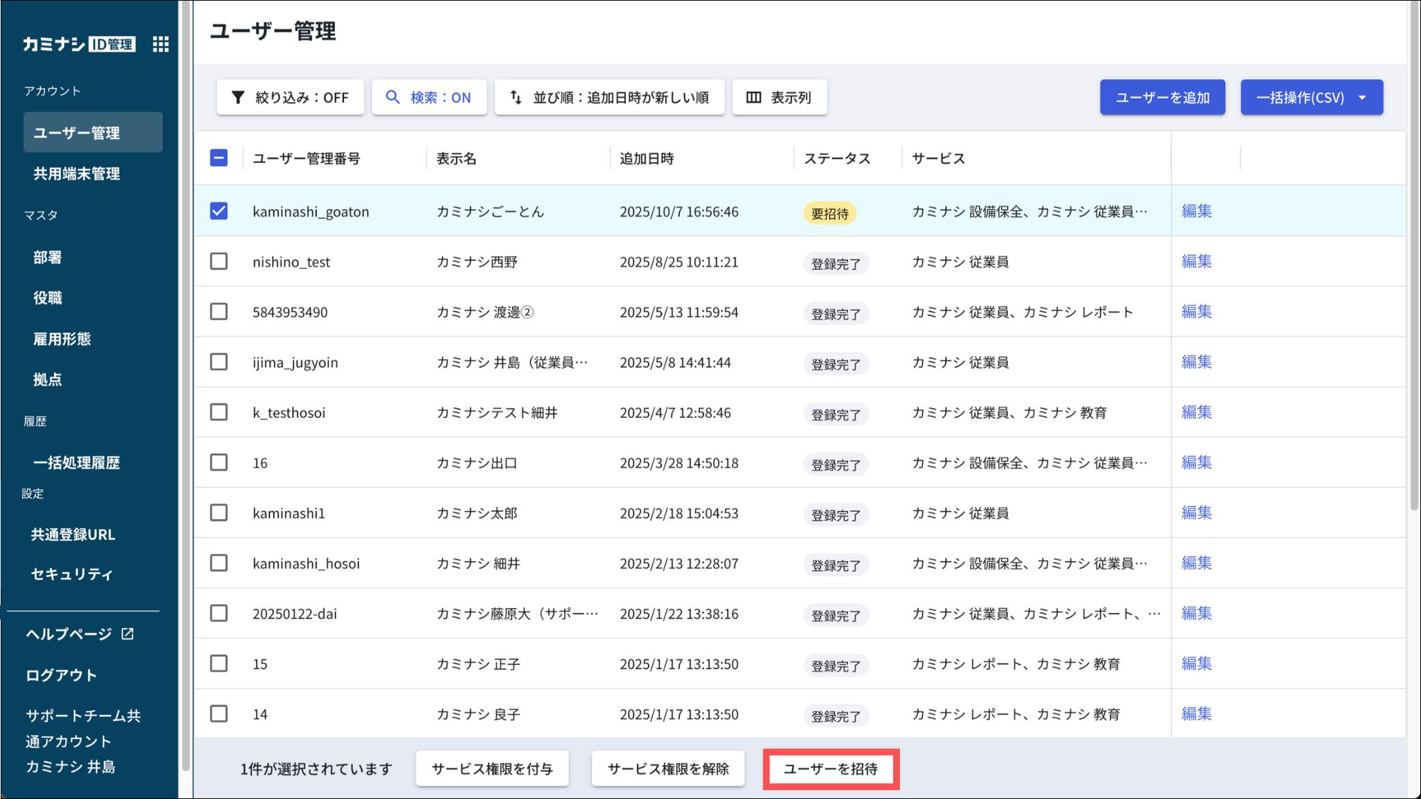 • 特徴:1名のみ選択されている場合、直接招待URLをコピーできます。それを用いて初期設定を行います。