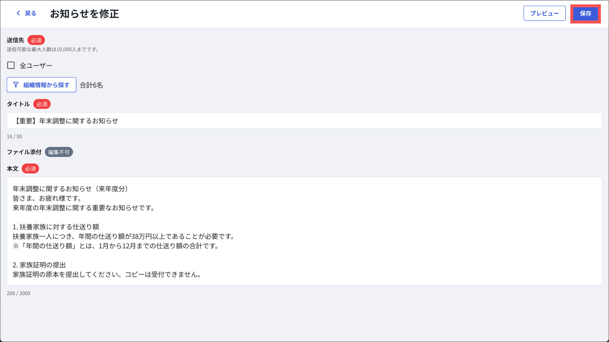 大幅な文言修正や添付ファイルを変更する場合は、新規にお知らせを作成してください。
