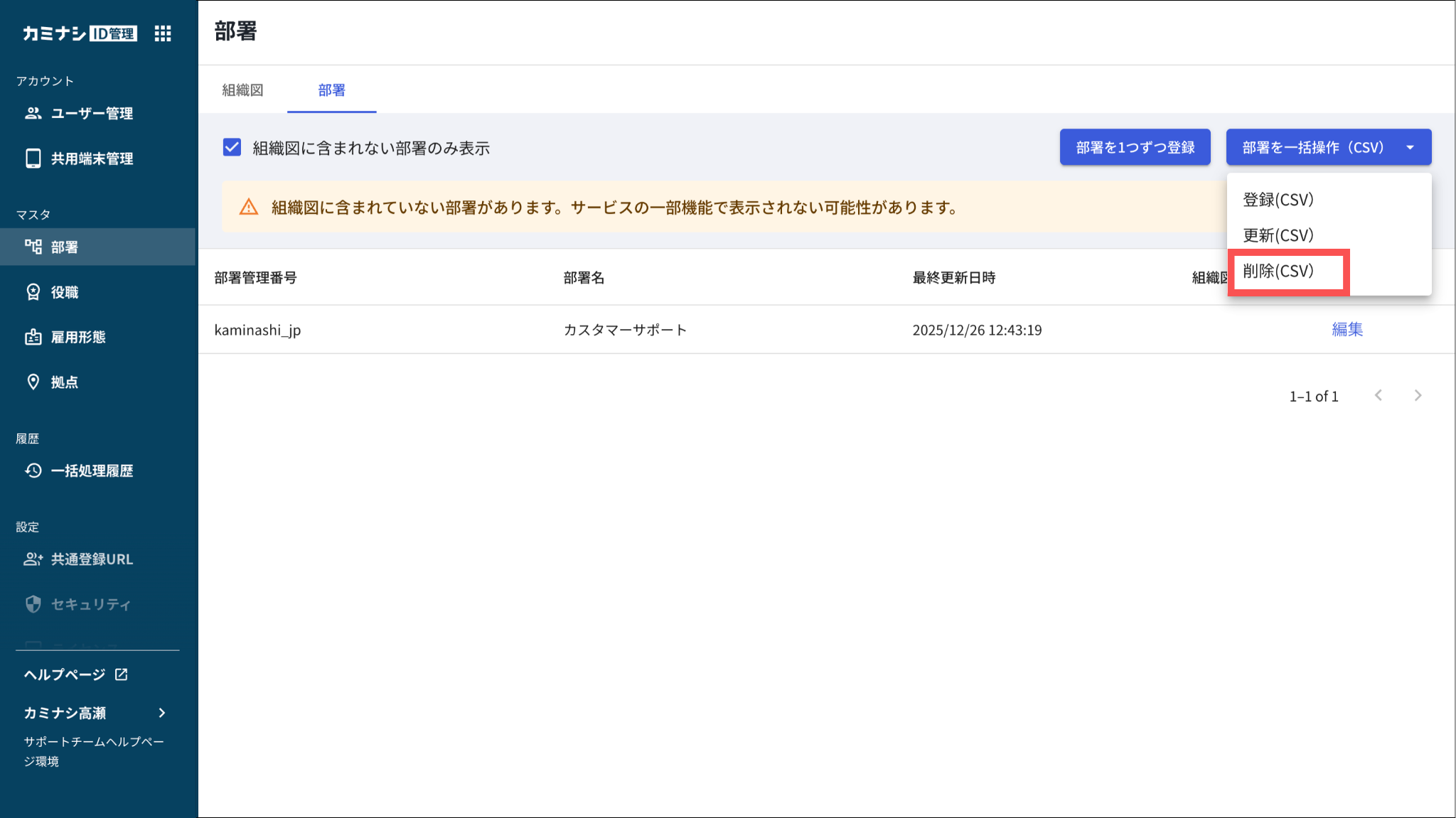 組織図に登録されていない、かつユーザーに紐づいていない部署のみ削除できます。