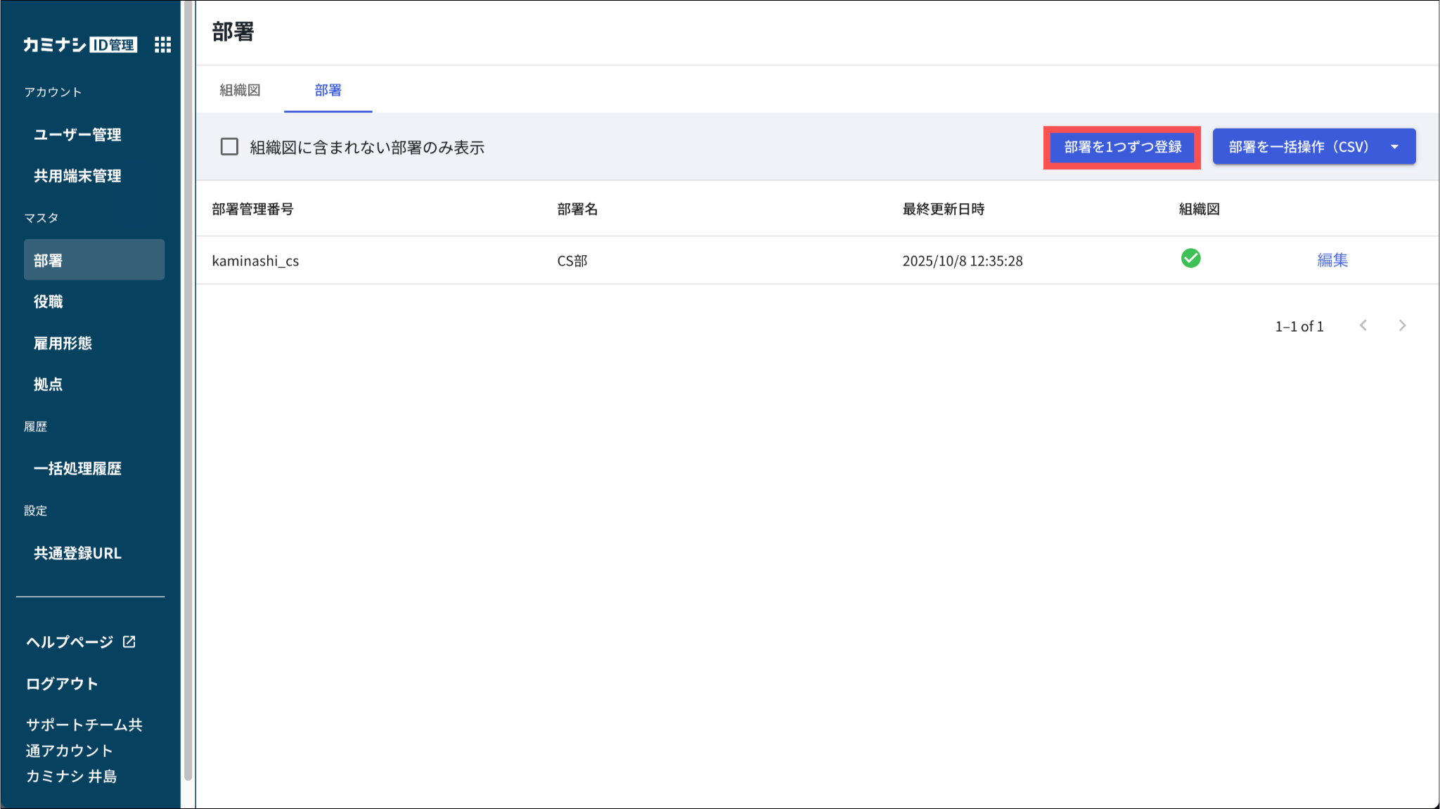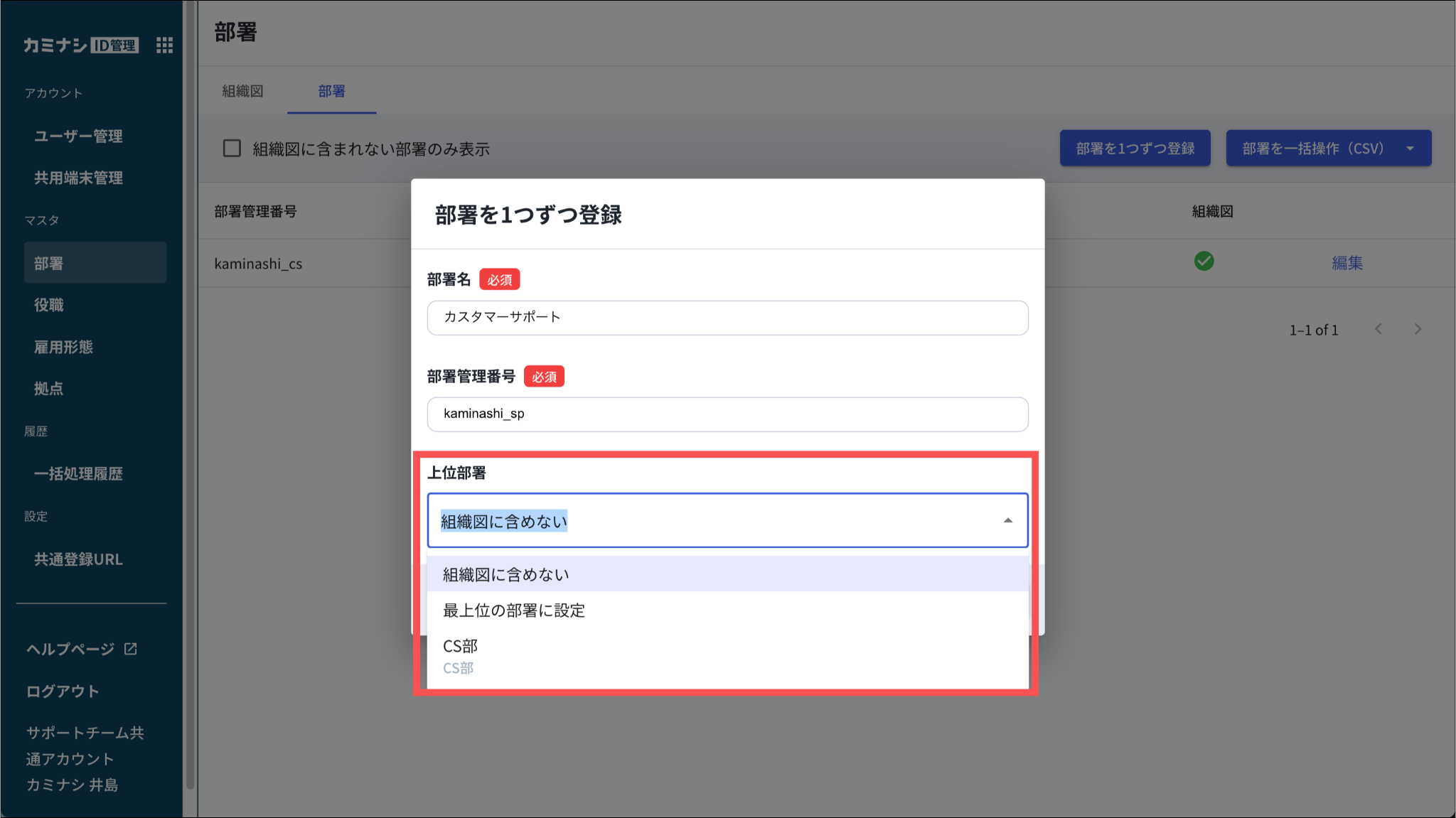 登録する部署を、組織図のどの部署の下に配置するかを選択します。
