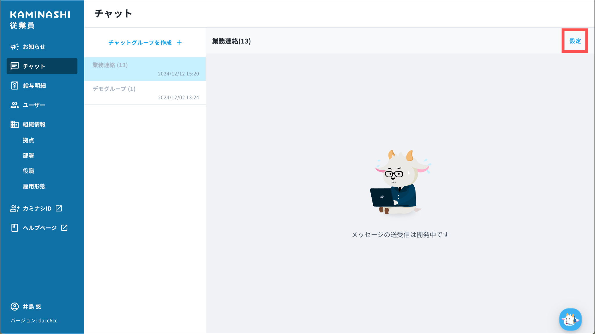 変更したいチャットグループを選択し、右上の「設定」のボタンを押すと変更ができます。